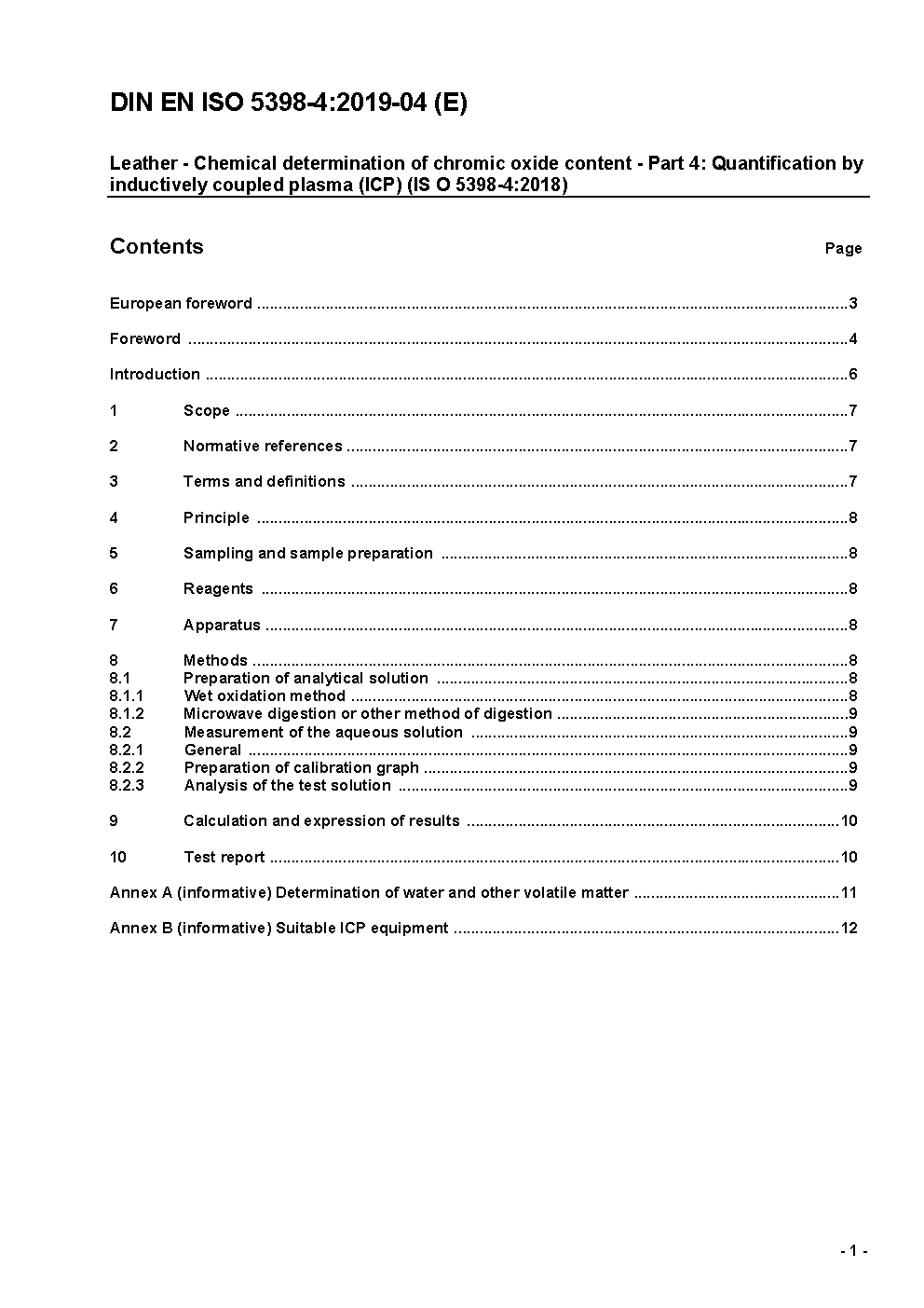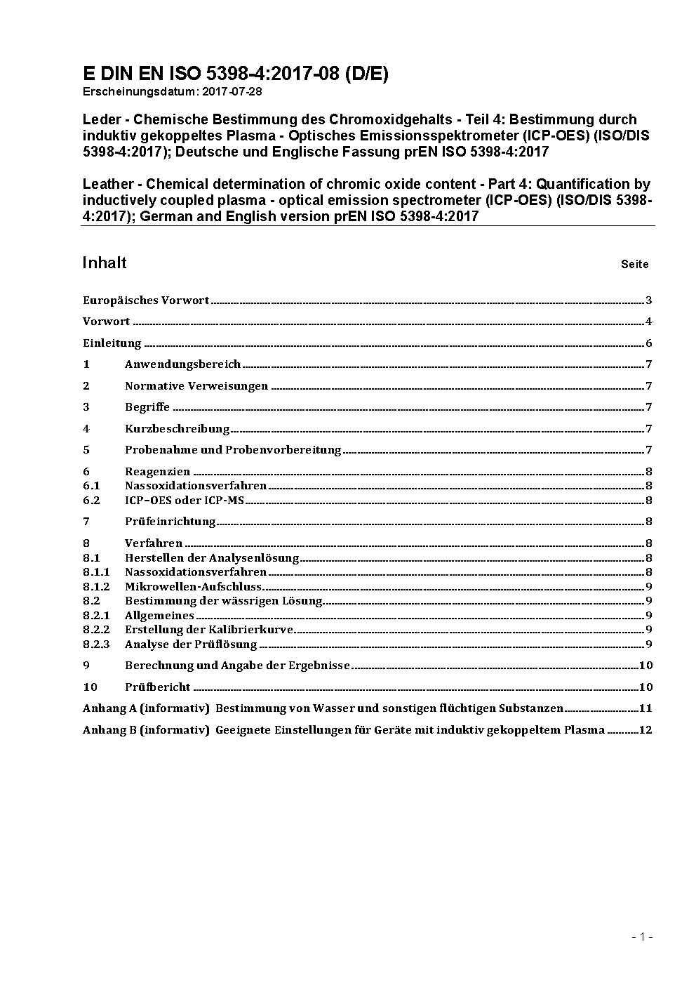 Leder - Chemische Bestimmung des Chromoxidgehalts - Teil 4: Bestimmung durch induktiv gekoppeltes Plasma - Optisches Emissionsspektrometer (ICP-OES) (ISO 5398-4:2007); Deutsche Fassung EN ISO 5398-4:2007