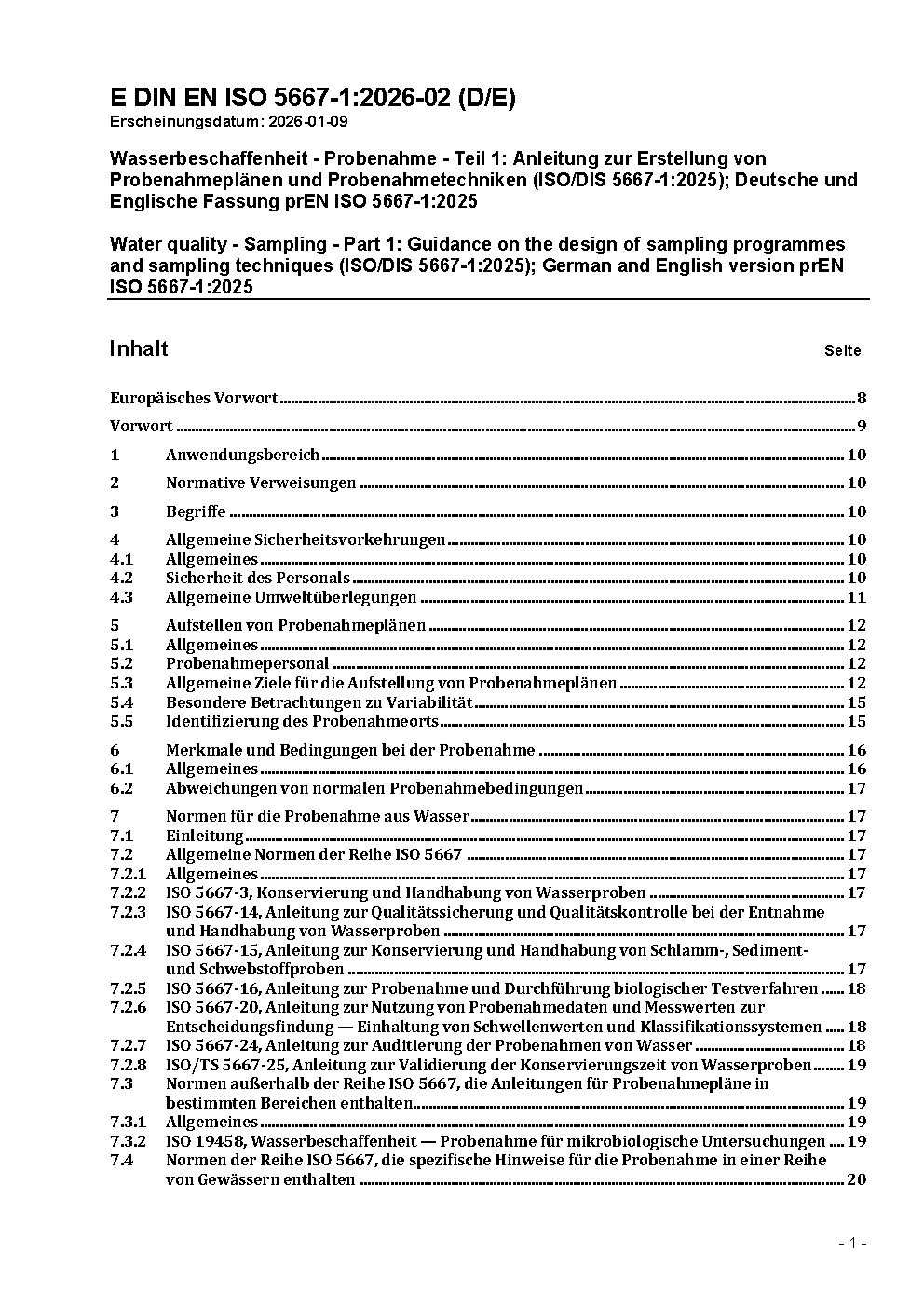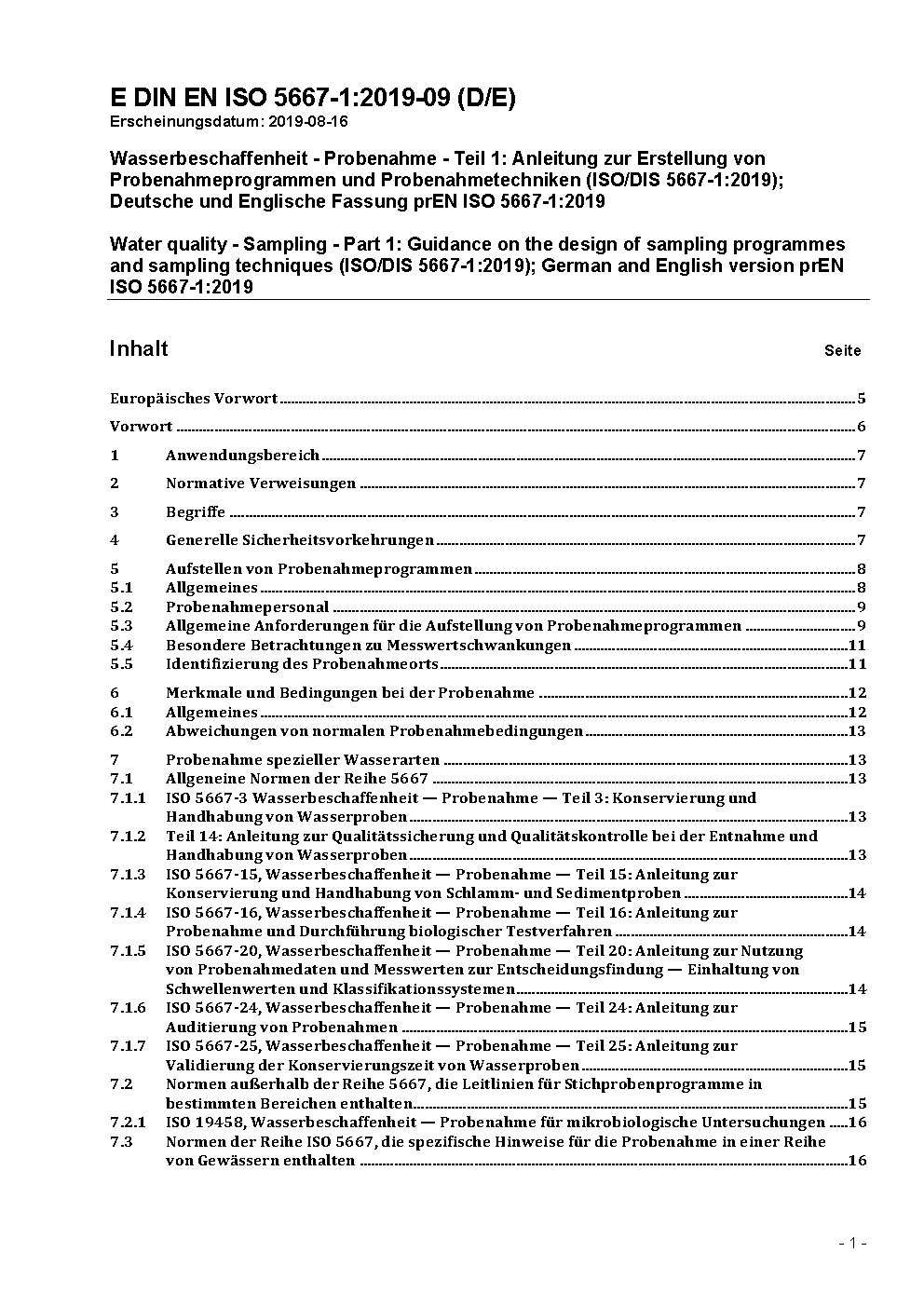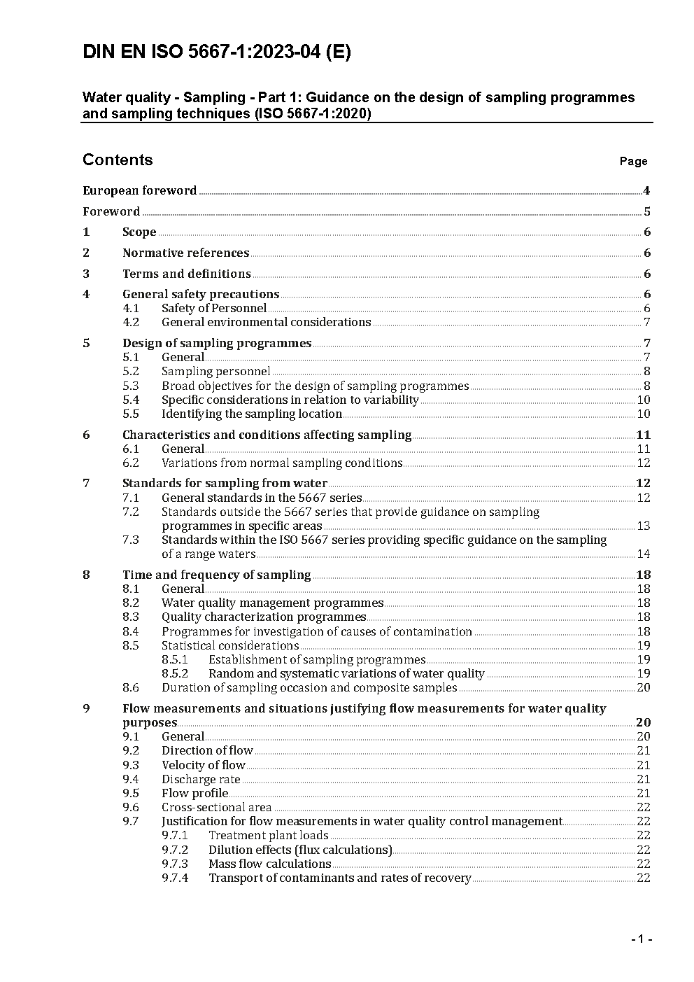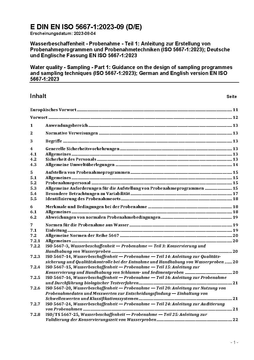 Wasserbeschaffenheit - Probenahme - Teil 1: Anleitung zur Erstellung von Probenahmeprogrammen und Probenahmetechniken (ISO 5667-1:2020); Deutsche Fassung EN ISO 5667-1:2022