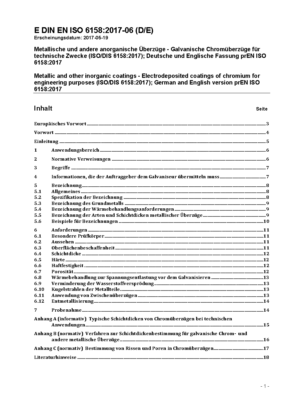 Metallische und andere anorganische Überzüge - Galvanische Chromüberzüge für technische Zwecke (ISO/DIS 6158:2017); Deutsche und Englische Fassung prEN ISO 6158:2017