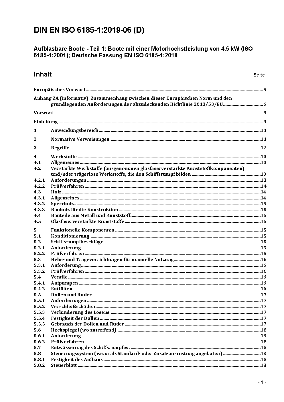 Aufblasbare Boote - Teil 1: Boote mit einer Motorhöchstleistung von 4,5 kW (ISO 6185-1:2001); Deutsche Fassung EN ISO 6185-1:2001