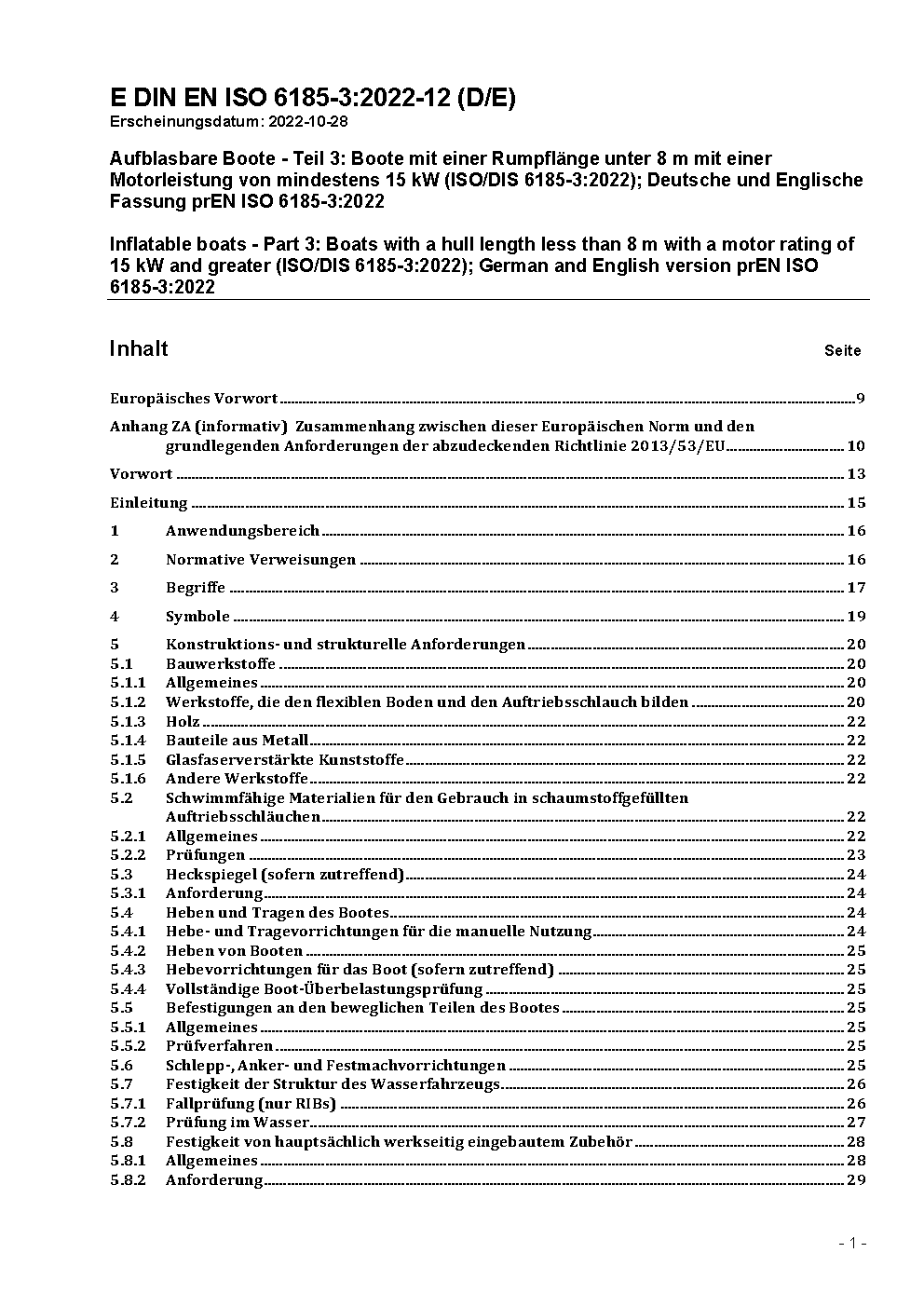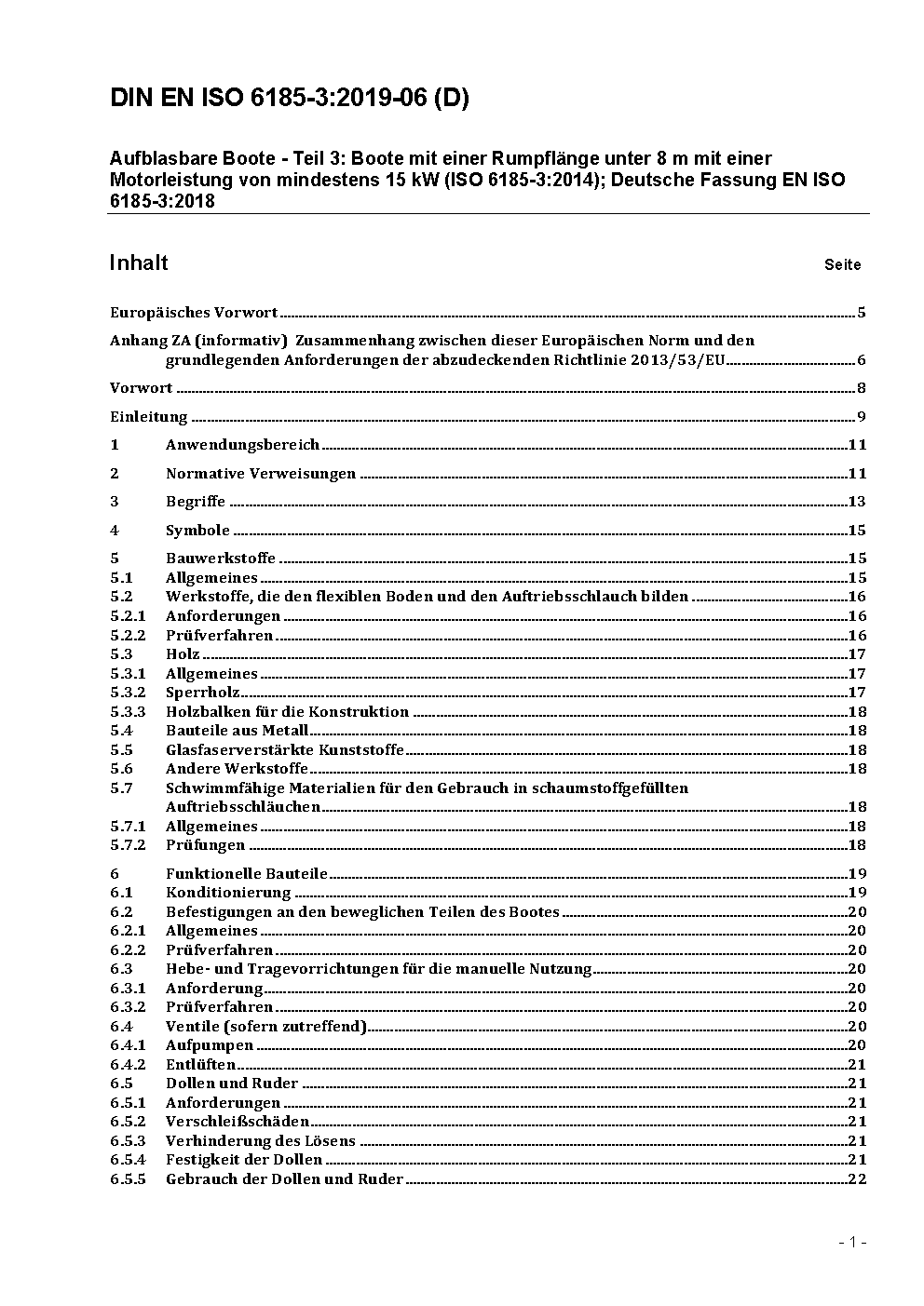 Aufblasbare Boote - Teil 3: Boote mit einer Motorhöchstleistung von mindestens 15 kW (ISO 6185-3:2001); Deutsche Fassung EN ISO 6185-3:2001 / Achtung: Übergangsfrist, festgelegt durch DIN EN ISO 6185-3 (2014-12), bis 2016-08-31 beachten.