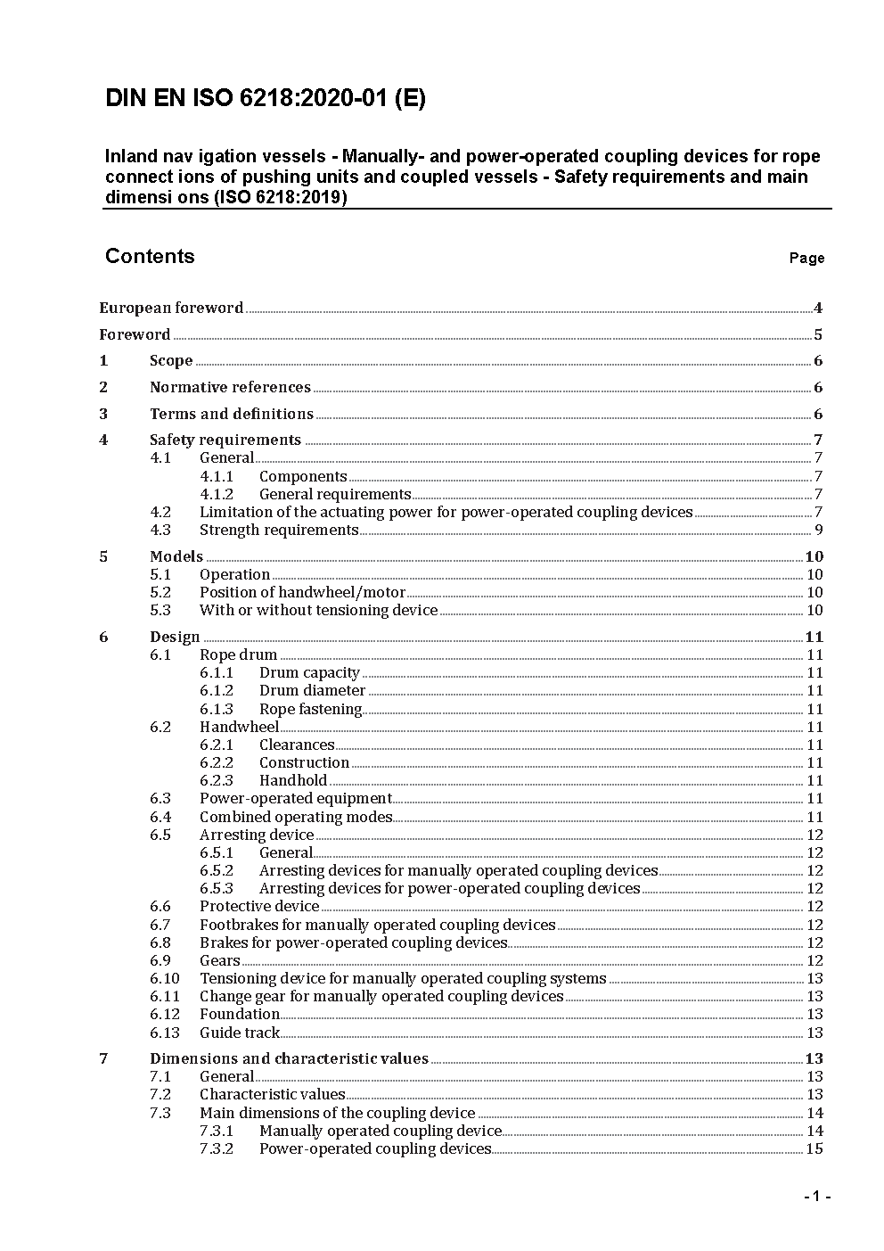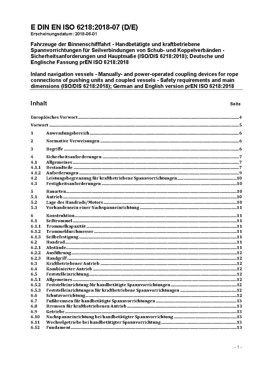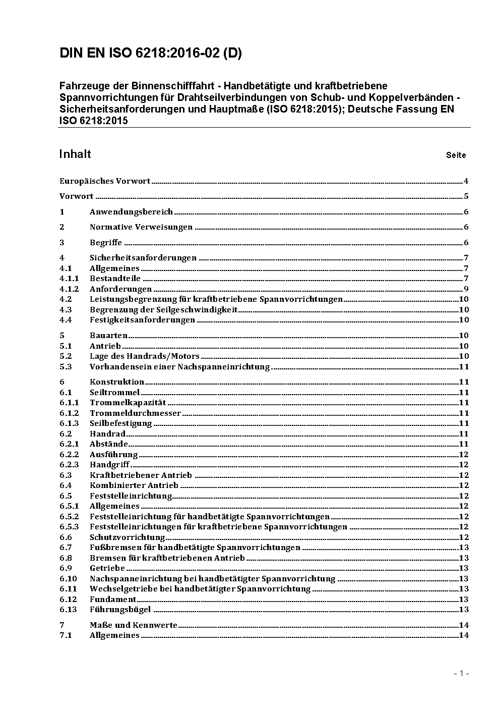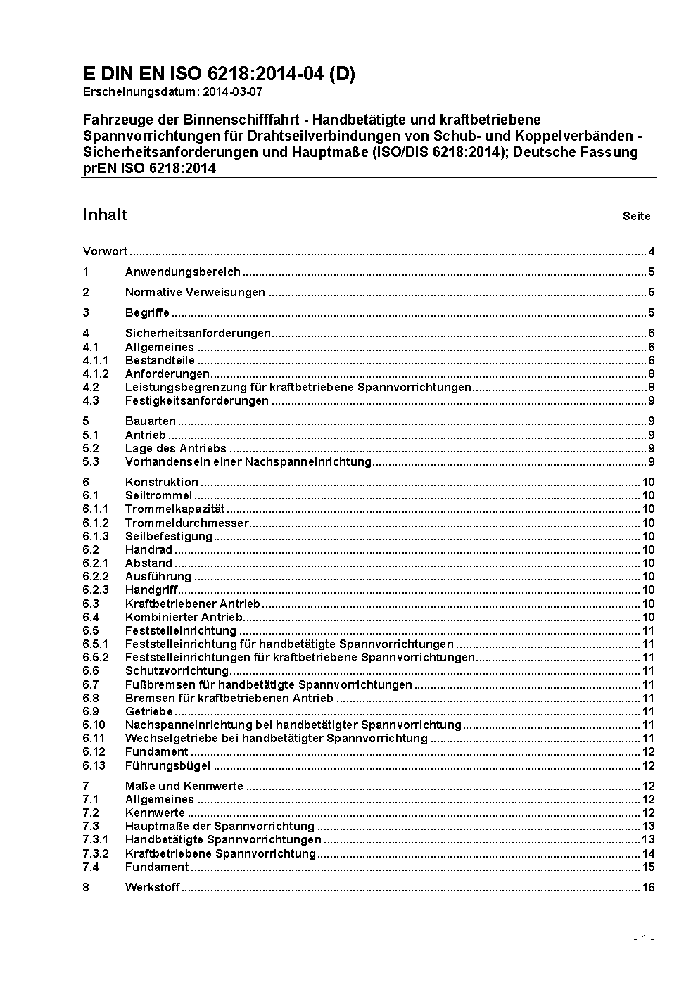 Fahrzeuge der Binnenschifffahrt - Handbetätigte und kraftbetriebene Spannvorrichtungen für Drahtseilverbindungen von Schub- und Koppelverbänden - Sicherheitsanforderungen und Hauptmaße (ISO/DIS 6218:2014); Deutsche Fassung prEN ISO 6218:2014