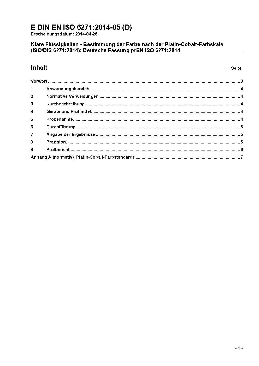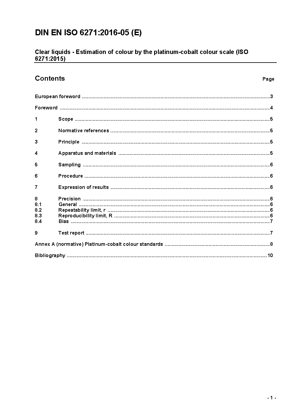 Clear liquids - Estimation of colour by the platinum-cobalt colour scale (ISO 6271:2015); German version EN ISO 6271:2015