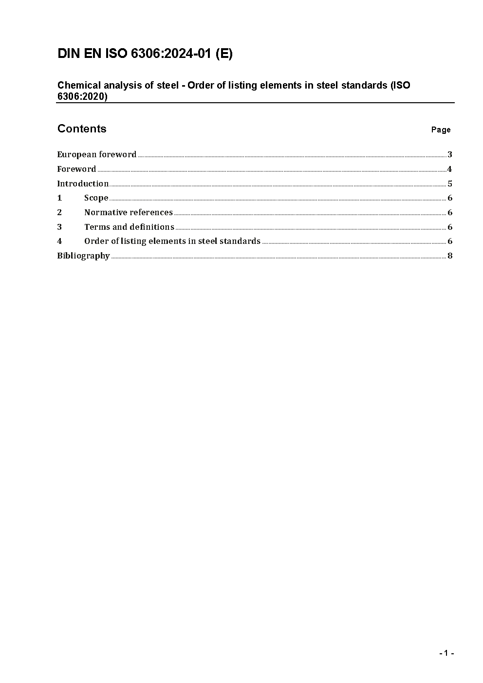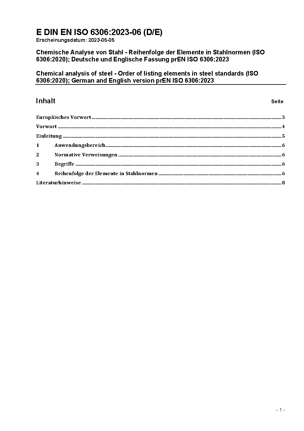 Chemical analysis of steel - Order of listing elements in steel standards (ISO 6306:2020); German and English version prEN ISO 6306:2023