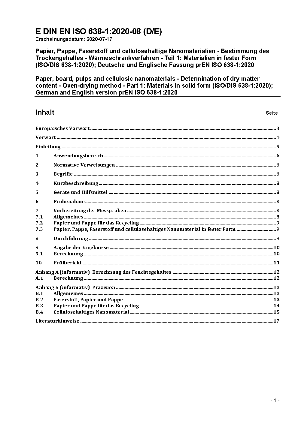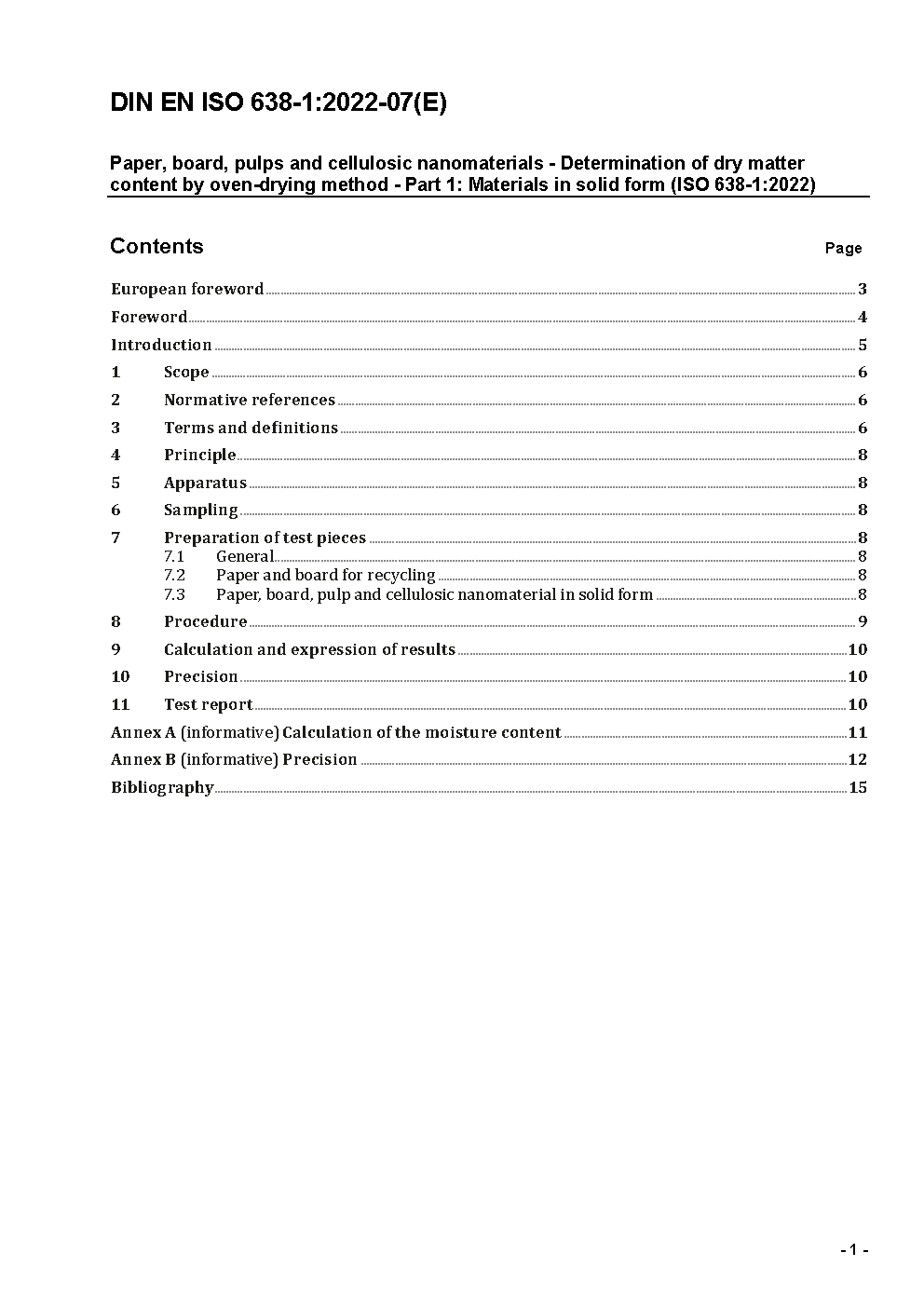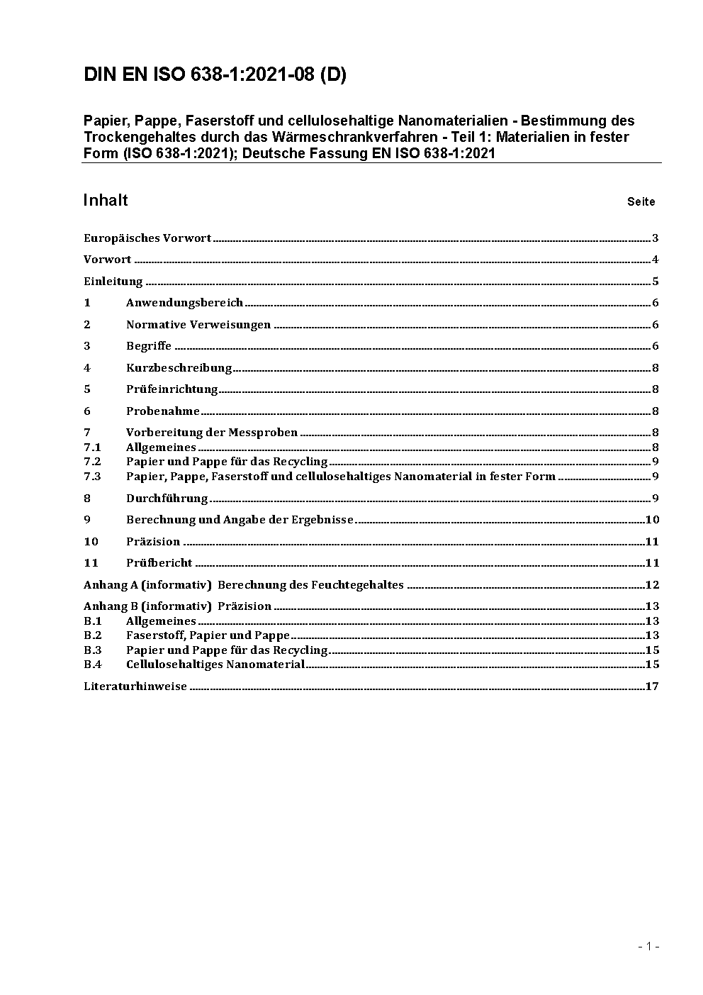 Paper, board, pulps and cellulosic nanomaterials - Determination of dry matter content by oven-drying method - Part 1: Materials in solid form (ISO 638-1:2021); German version EN ISO 638-1:2021