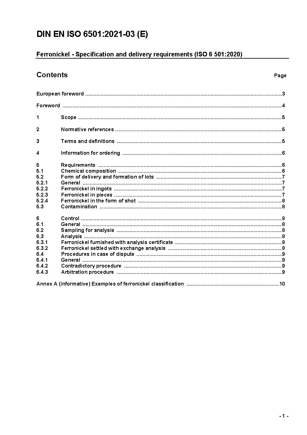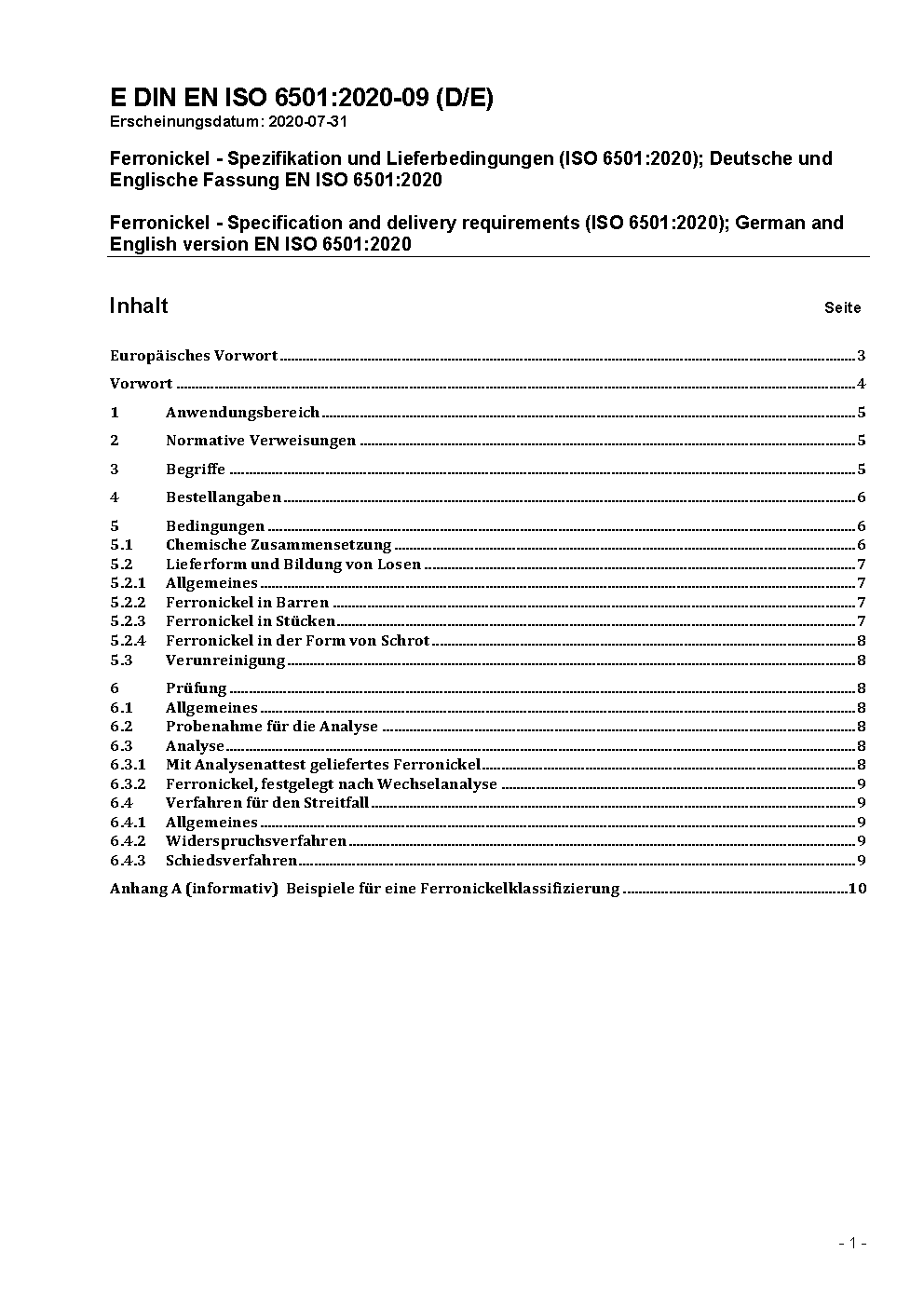 Ferronickel - Specification and delivery requirements (ISO 6501:2020); German version EN ISO 6501:2020