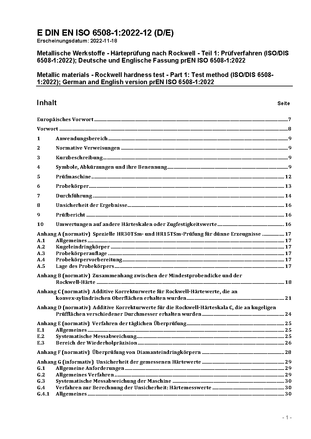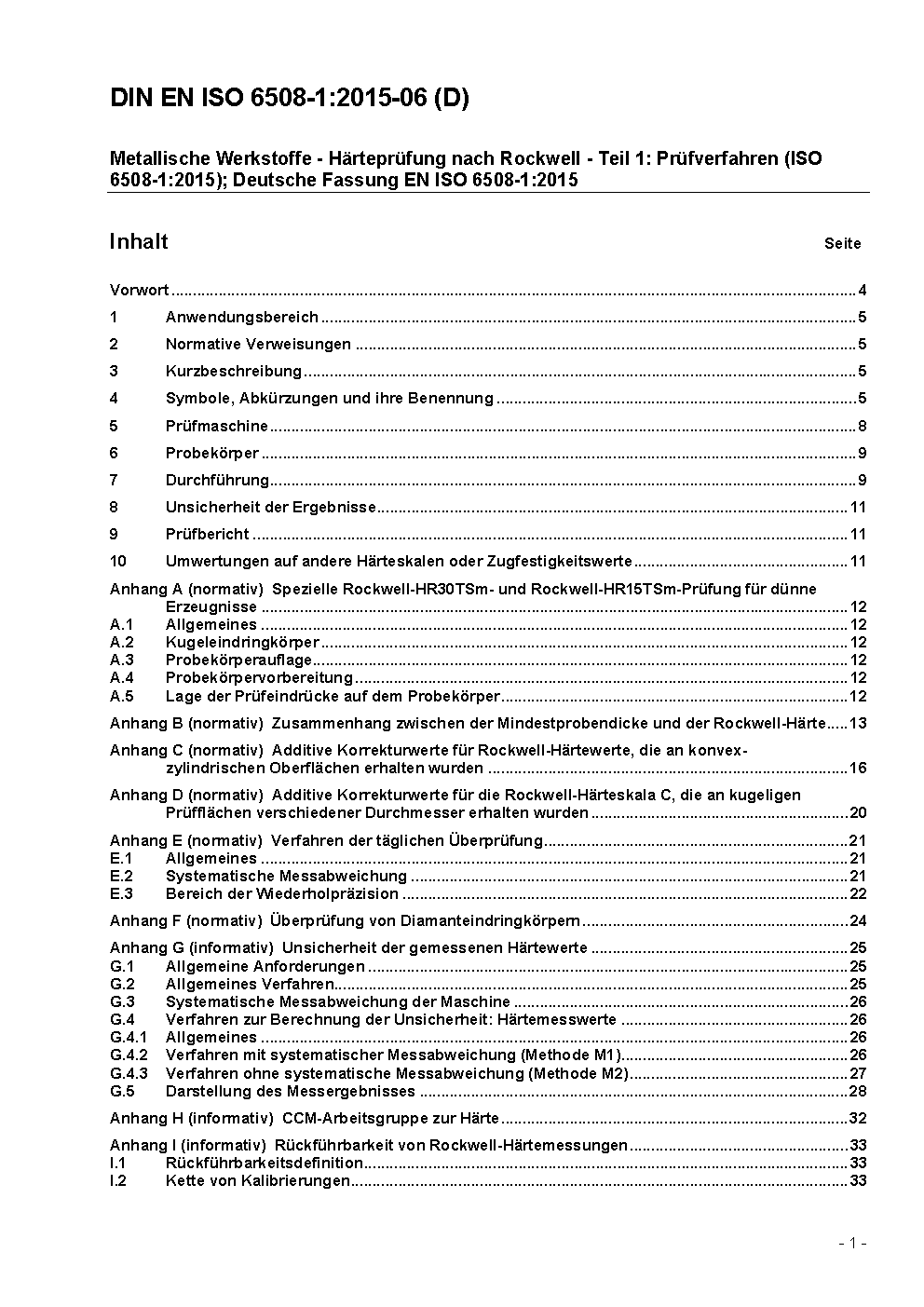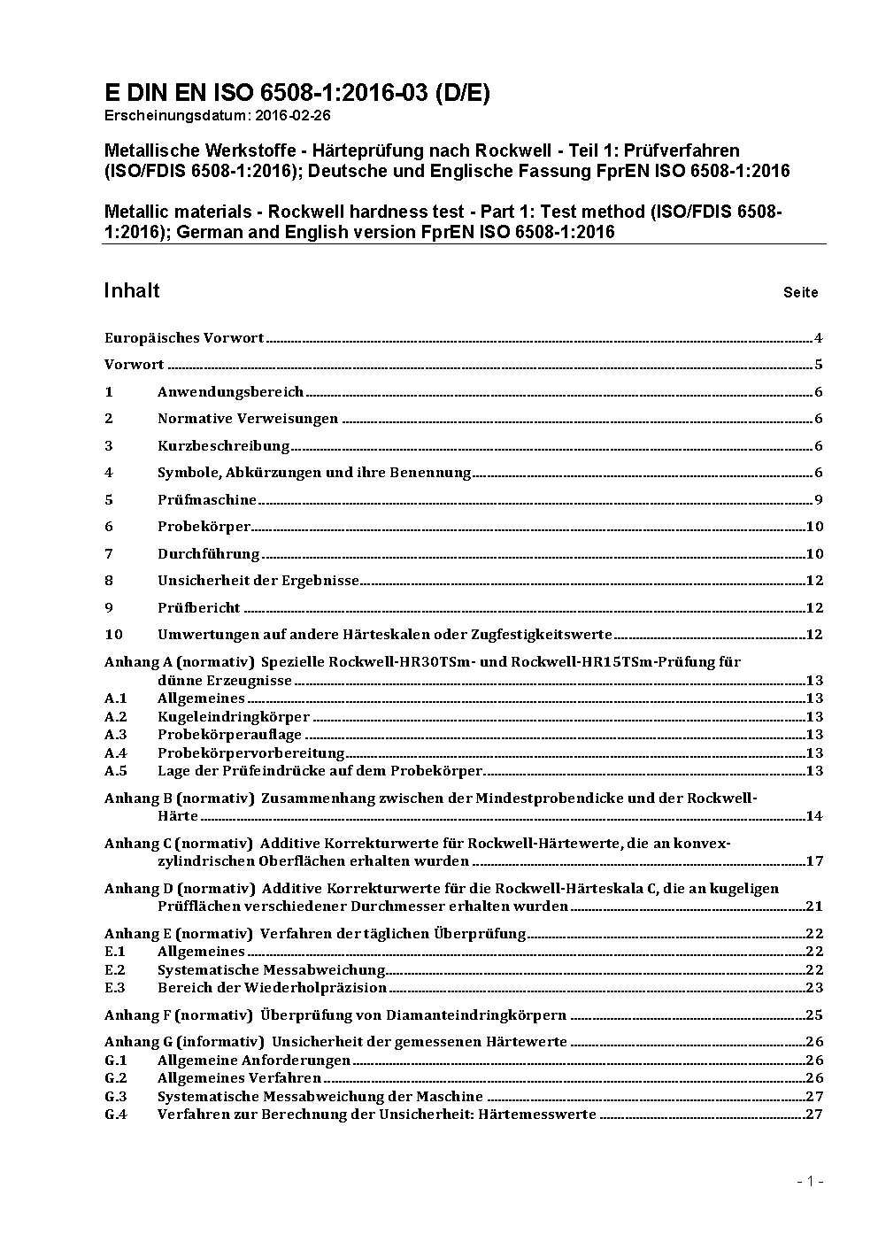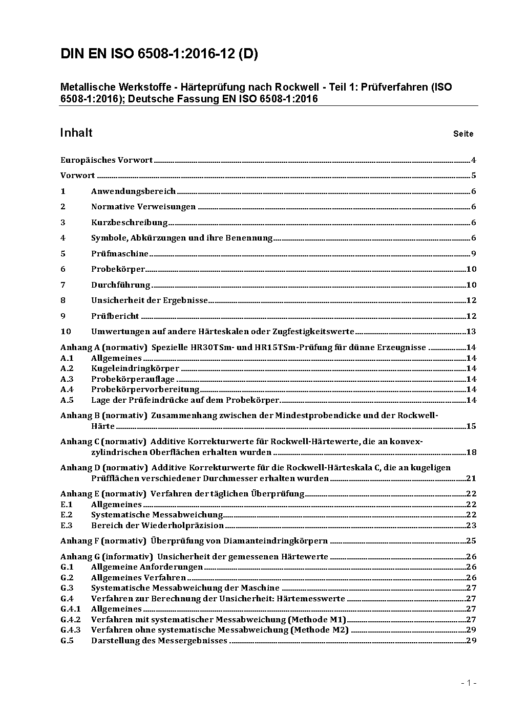 Metallische Werkstoffe - Härteprüfung nach Rockwell - Teil 1: Prüfverfahren (ISO 6508-1:2016); Deutsche Fassung EN ISO 6508-1:2016