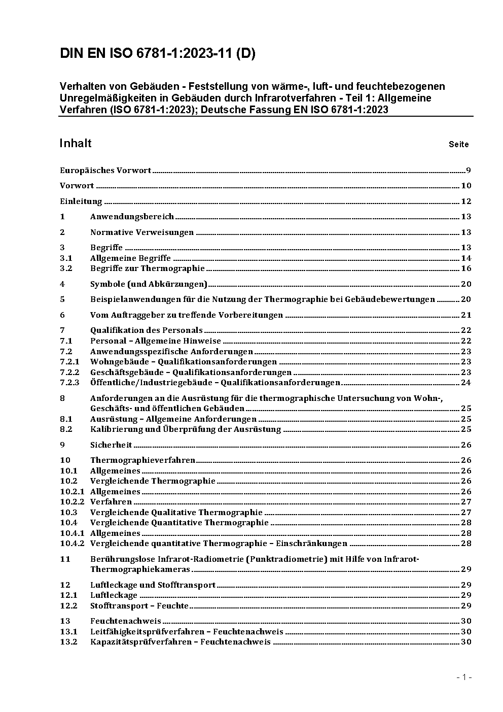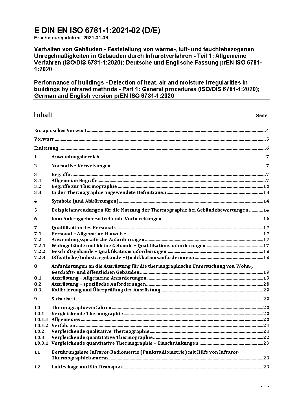 Verhalten von Gebäuden - Feststellung von wärme-, luft- und feuchtebezogenen Unregelmäßigkeiten in Gebäuden durch Infrarotverfahren - Teil 1: Allgemeine Verfahren (ISO 6781-1:2023); Deutsche Fassung EN ISO 6781-1:2023