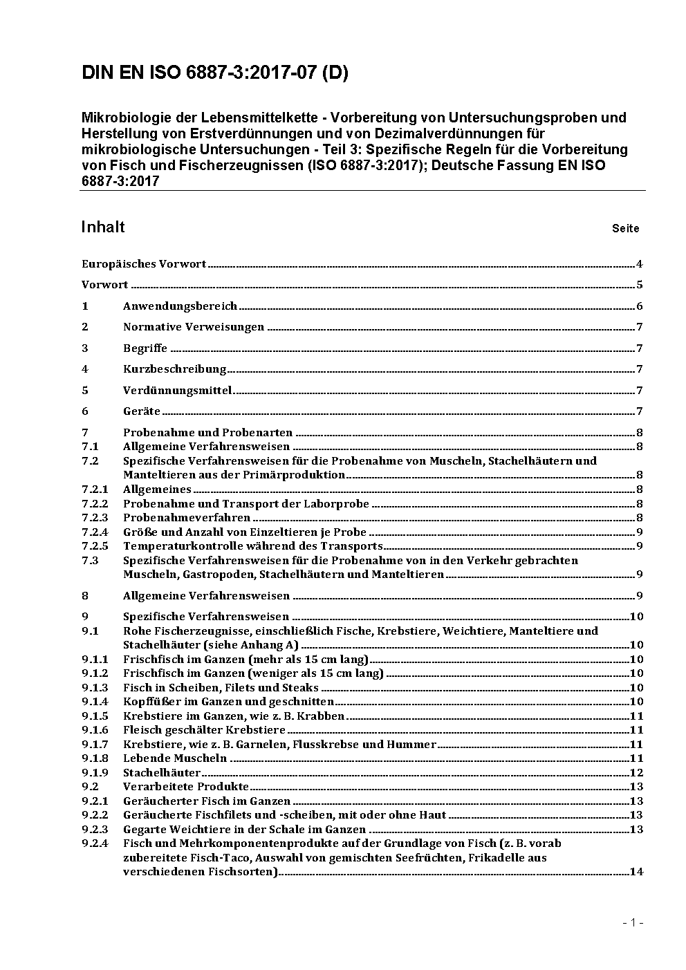 Microbiology of food and animal feeding stuffs - Preparation of test samples, initial suspension and decimal dilutions for microbiological examination - Part 3: Specific rules for the preparation of fish and fishery products (ISO 6887-3:2003); German version EN ISO 6887-3:2003