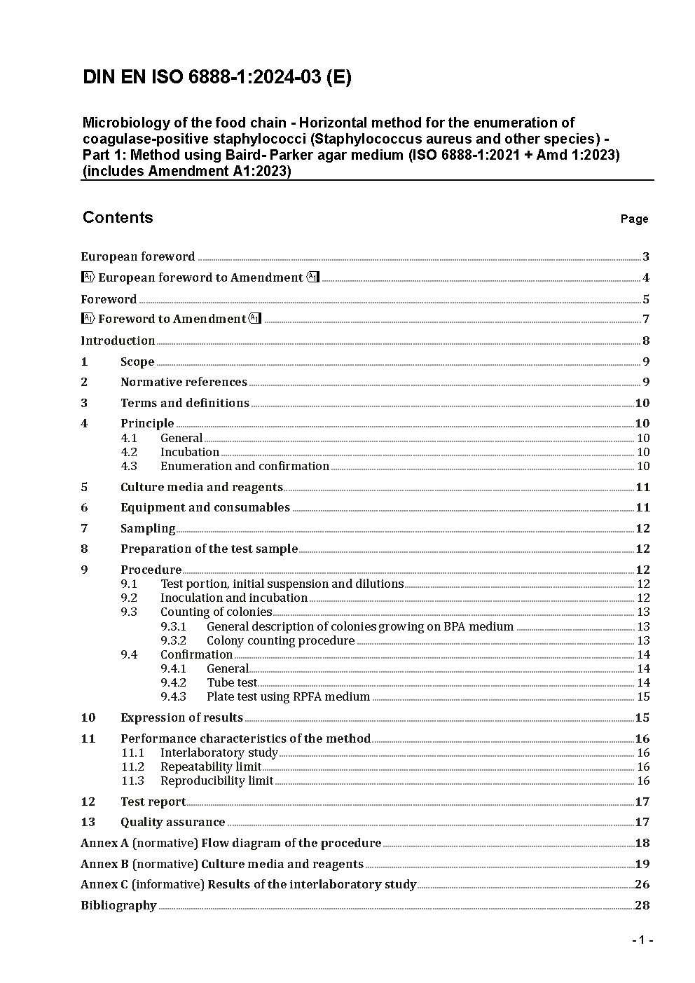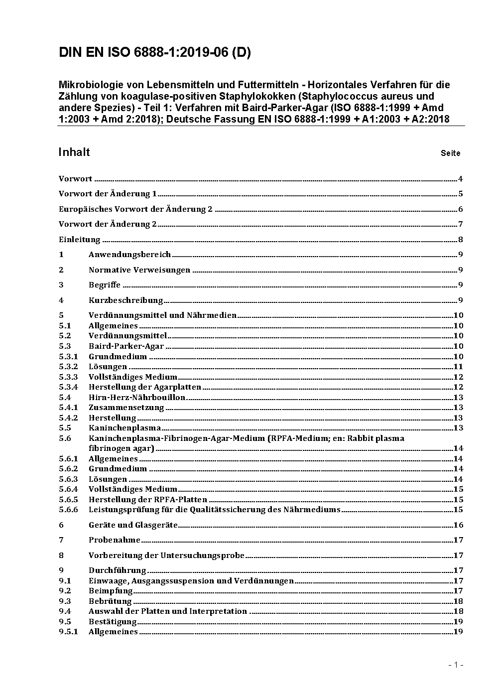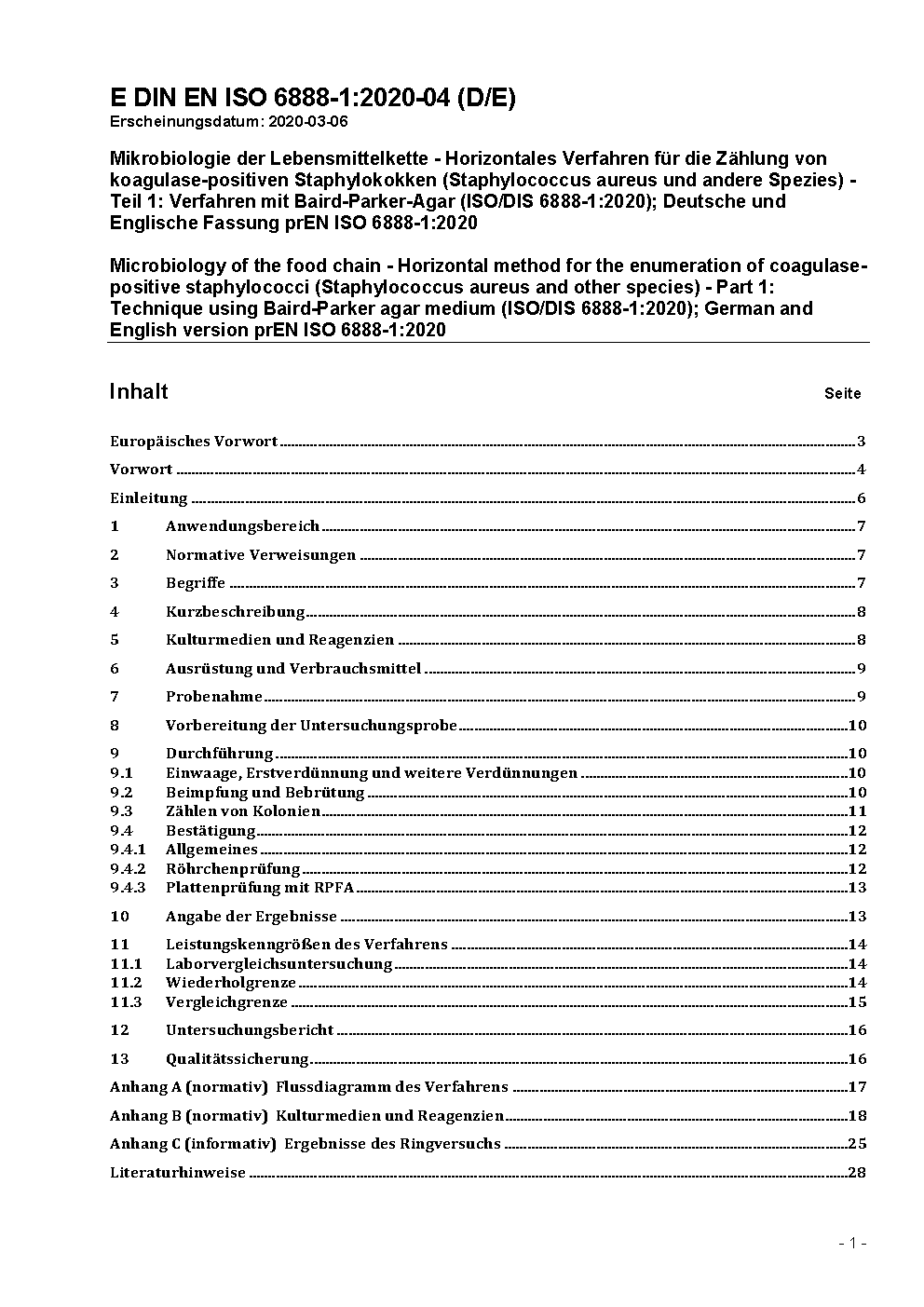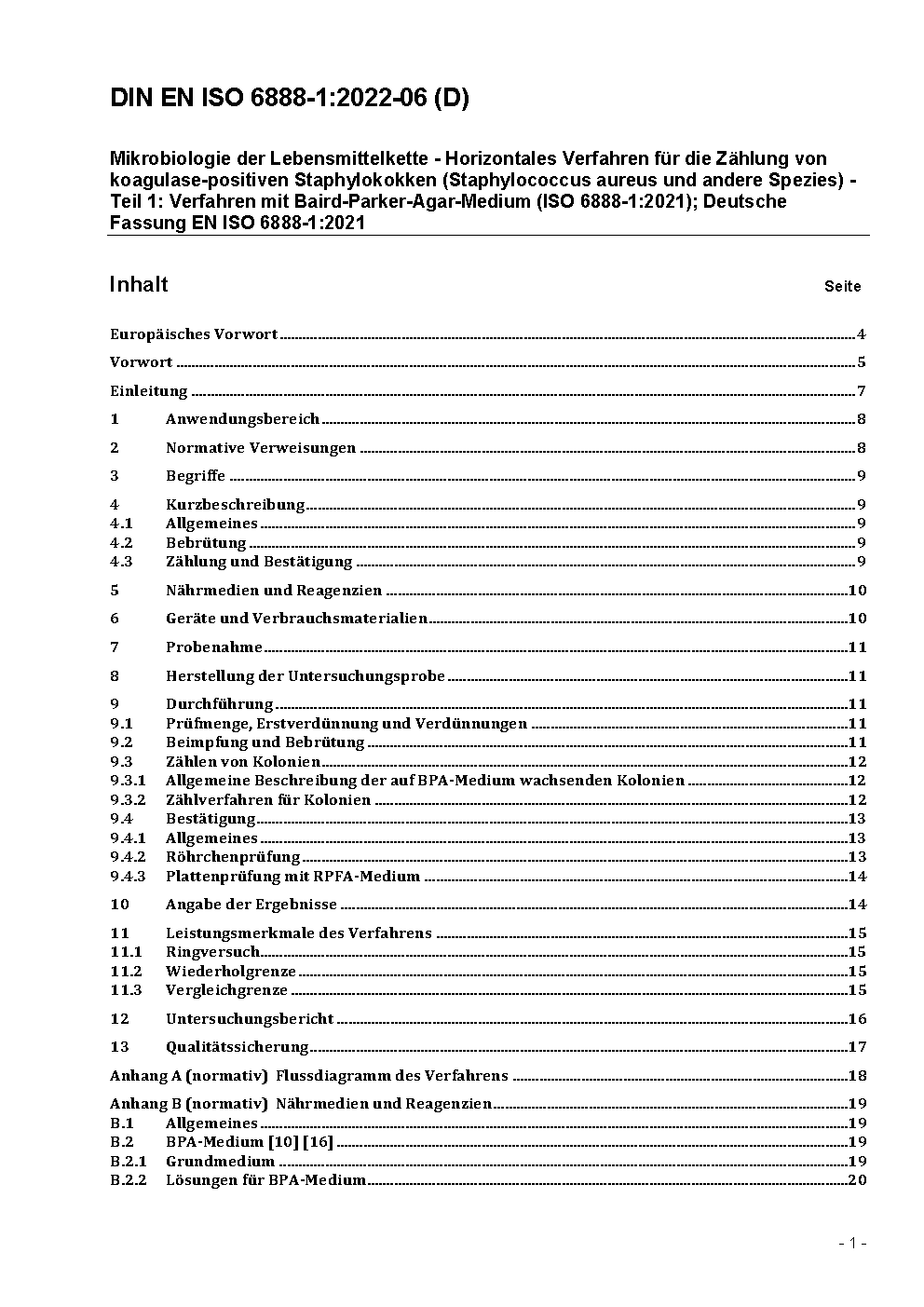 Mikrobiologie von Lebensmitteln und Futtermitteln - Horizontales Verfahren für die Zählung von koagulase-positiven Staphylokokken (Staphylococcus aureus und andere Species) - Teil 1: Verfahren mit Baird-Parker-Agar (ISO 6888-1:1999 + AMD 1:2003); Deutsche Fassung EN ISO 6888-1:1999 + A1:2003