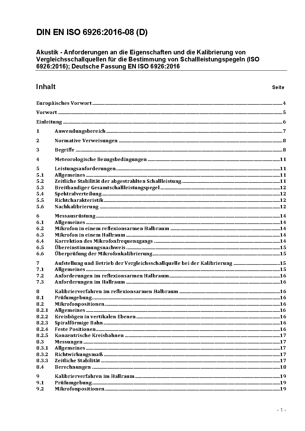 Akustik - Anforderungen an die Eigenschaften und die Kalibrierung von Vergleichsschallquellen für die Bestimmung von Schallleistungspegeln (ISO 6926:2000); Deutsche Fassung EN ISO 6926:2001