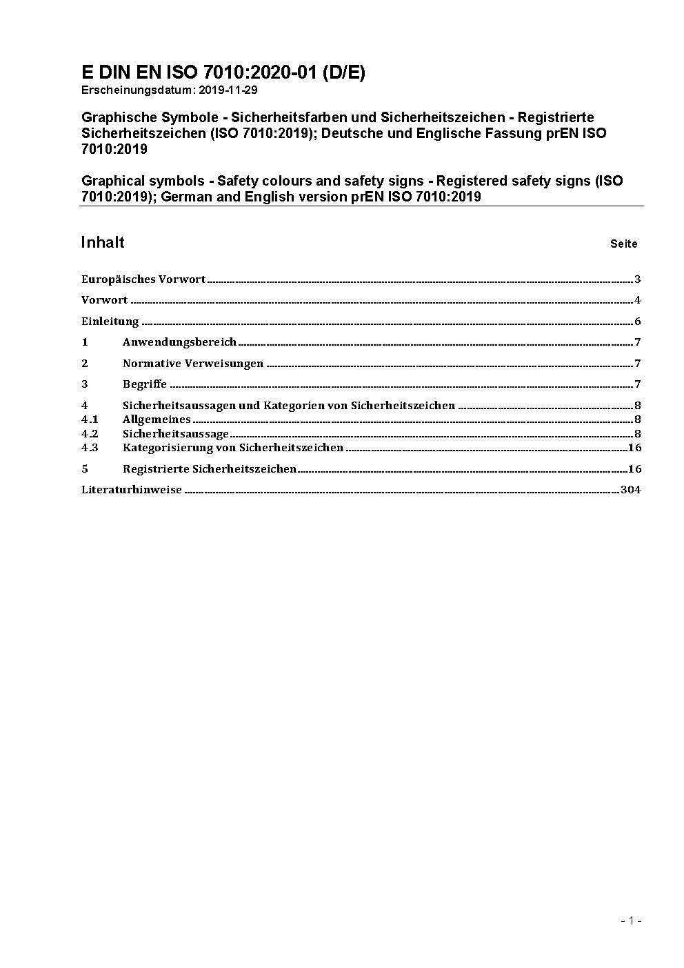 Graphical symbols - Safety colours and safety signs - Registered safety signs (ISO 7010:2019); German and English version prEN ISO 7010:2019