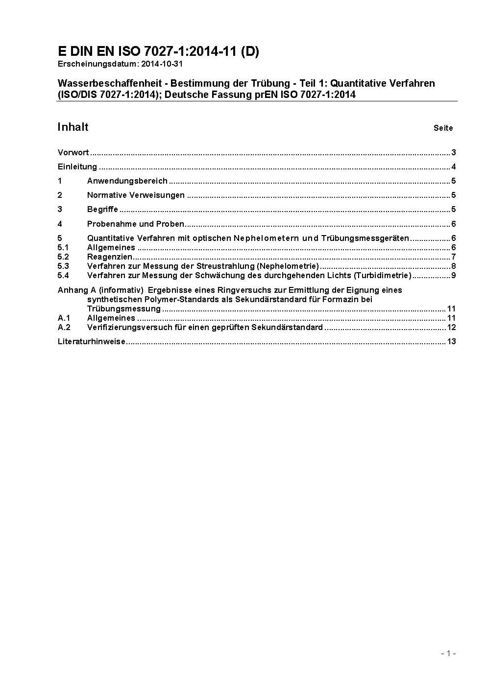 Wasserbeschaffenheit - Bestimmung der Trübung - Teil 1: Quantitative Verfahren (ISO/DIS 7027-1:2014); Deutsche Fassung prEN ISO 7027-1:2014