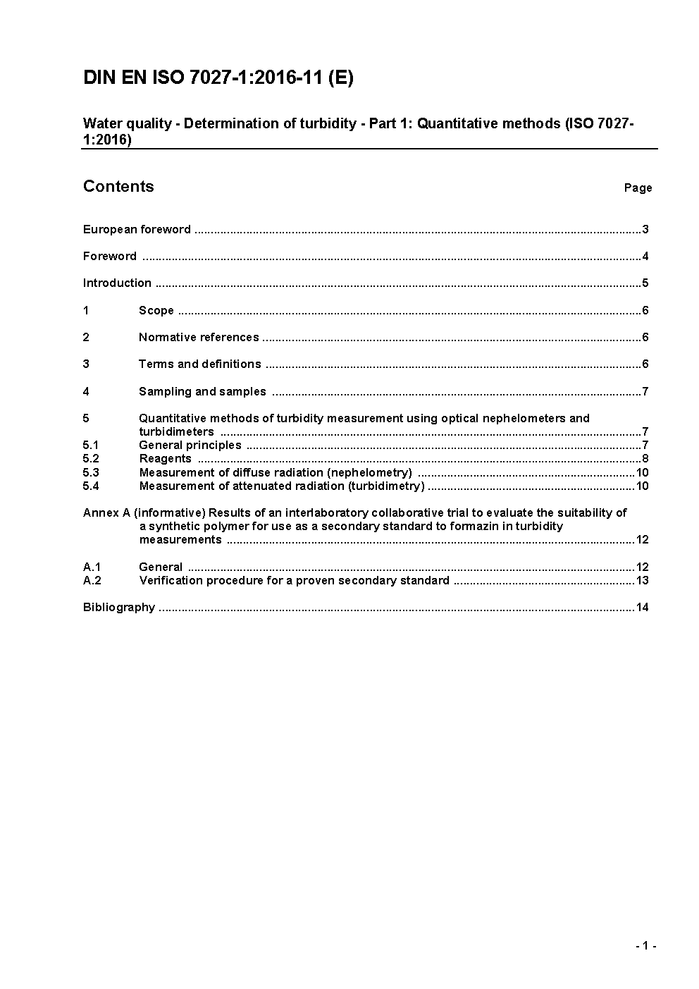 Water quality - Determination of turbidity - Part 1: Quantitative methods (ISO/DIS 7027-1:2014); German version prEN ISO 7027-1:2014