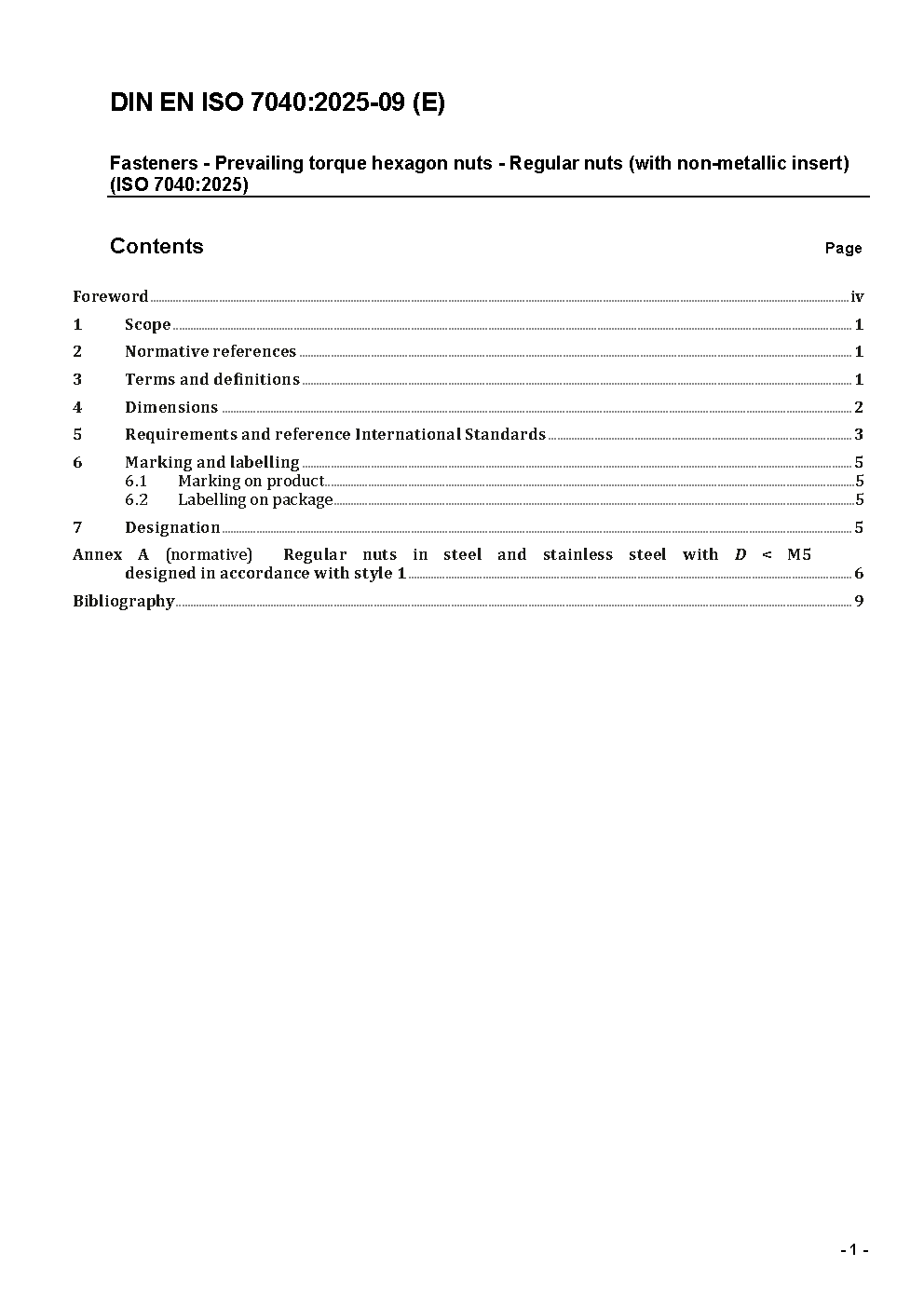 Prevailing torque type hexagon nuts (with non-metallic insert), style 1 - Property classes 5, 8 and 10 (ISO/FDIS 7040:2012); German version FprEN ISO 7040:2012