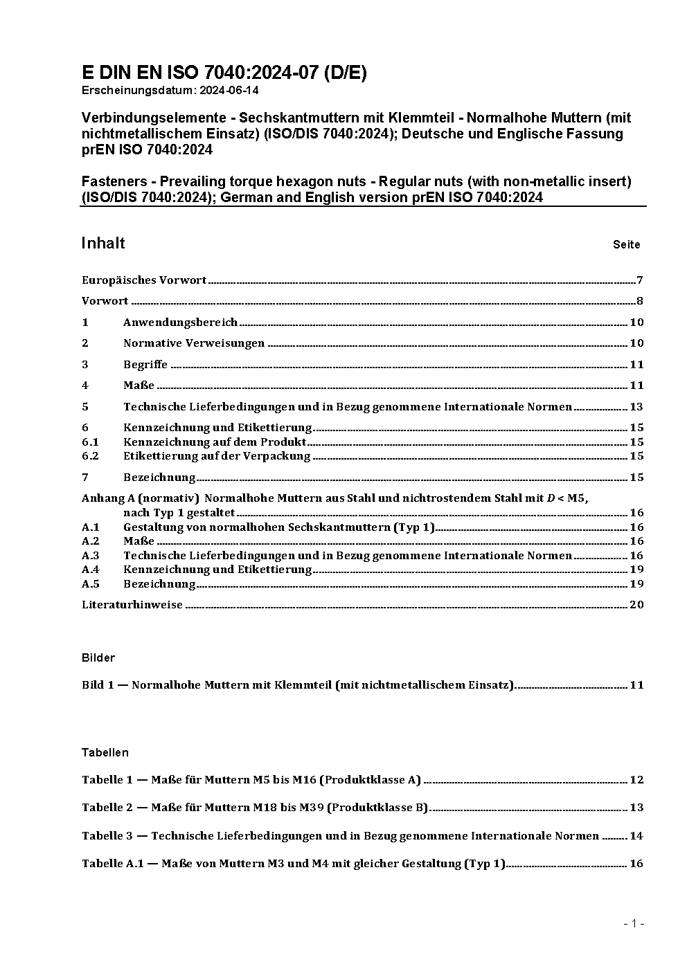 Sechskantmuttern mit Klemmteil (mit nichtmetallischem Einsatz), Typ 1 - Festigkeitsklassen 5, 8 und 10 (ISO/FDIS 7040:2012); Deutsche Fassung FprEN ISO 7040:2012