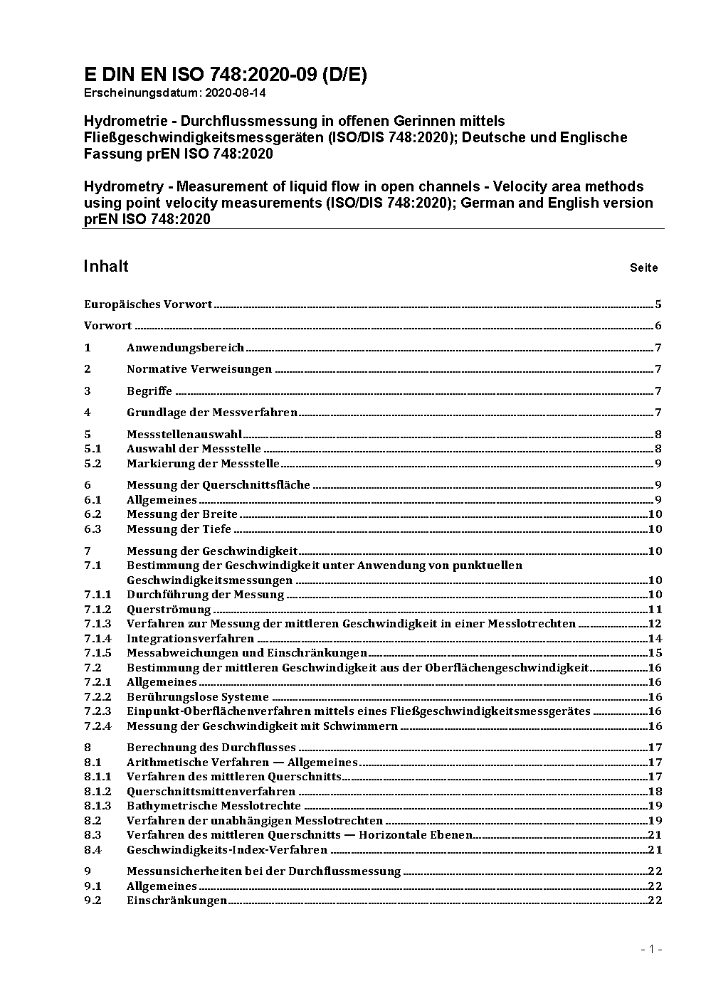 Hydrometry - Measurement of liquid flow in open channels - Velocity area methods using point velocity measurements (ISO/DIS 748:2020); German and English version prEN ISO 748:2020