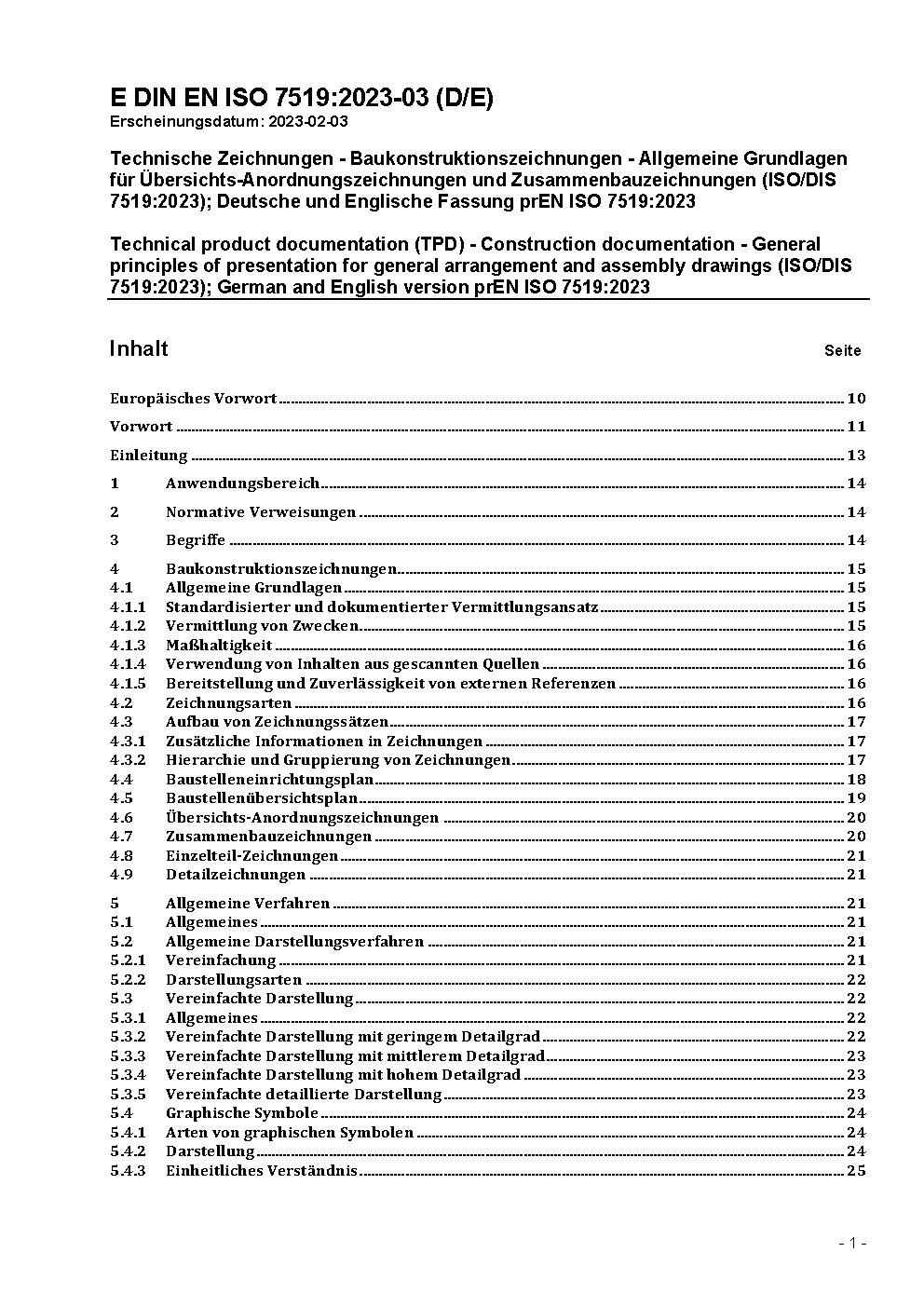 Technical product documentation (TPD) - Construction documentation - General principles of presentation for general arrangement and assembly drawings (ISO/FDIS 7519:2024); German and English version prEN ISO 7519:2024
