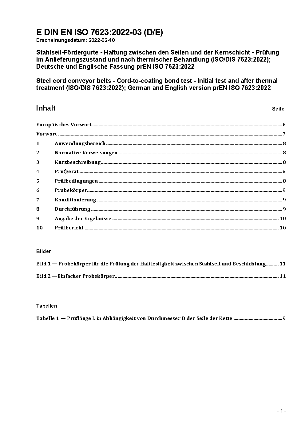 Steel cord conveyor belts - Cord-to-coating bond test - Initial test and after thermal treatment (ISO 7623:1996); German version prEN ISO 7623:1996