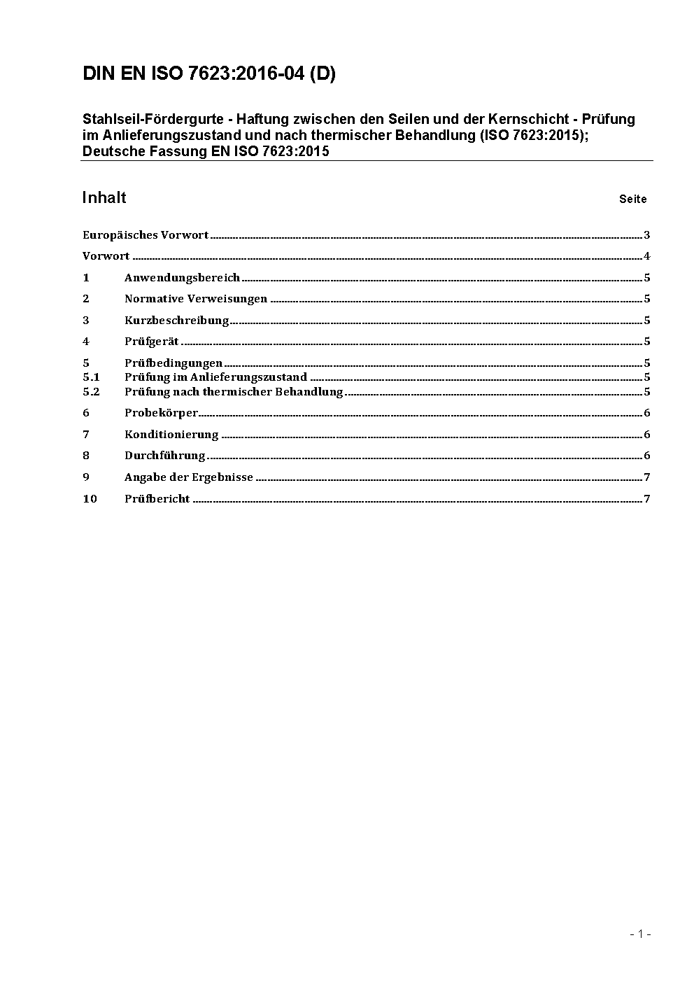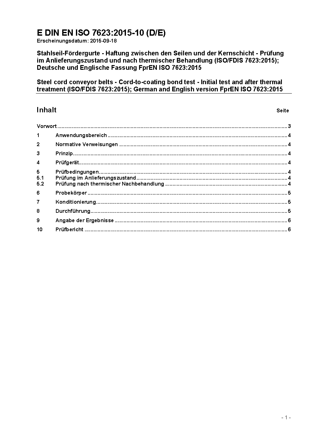 Stahlseil-Fördergurte - Haftung zwischen den Seilen und Kernschicht - Prüfung im Anlieferungszustand und nach thermischer Behandlung (ISO 7623:1996); Deutsche Fassung prEN ISO 7623:1996