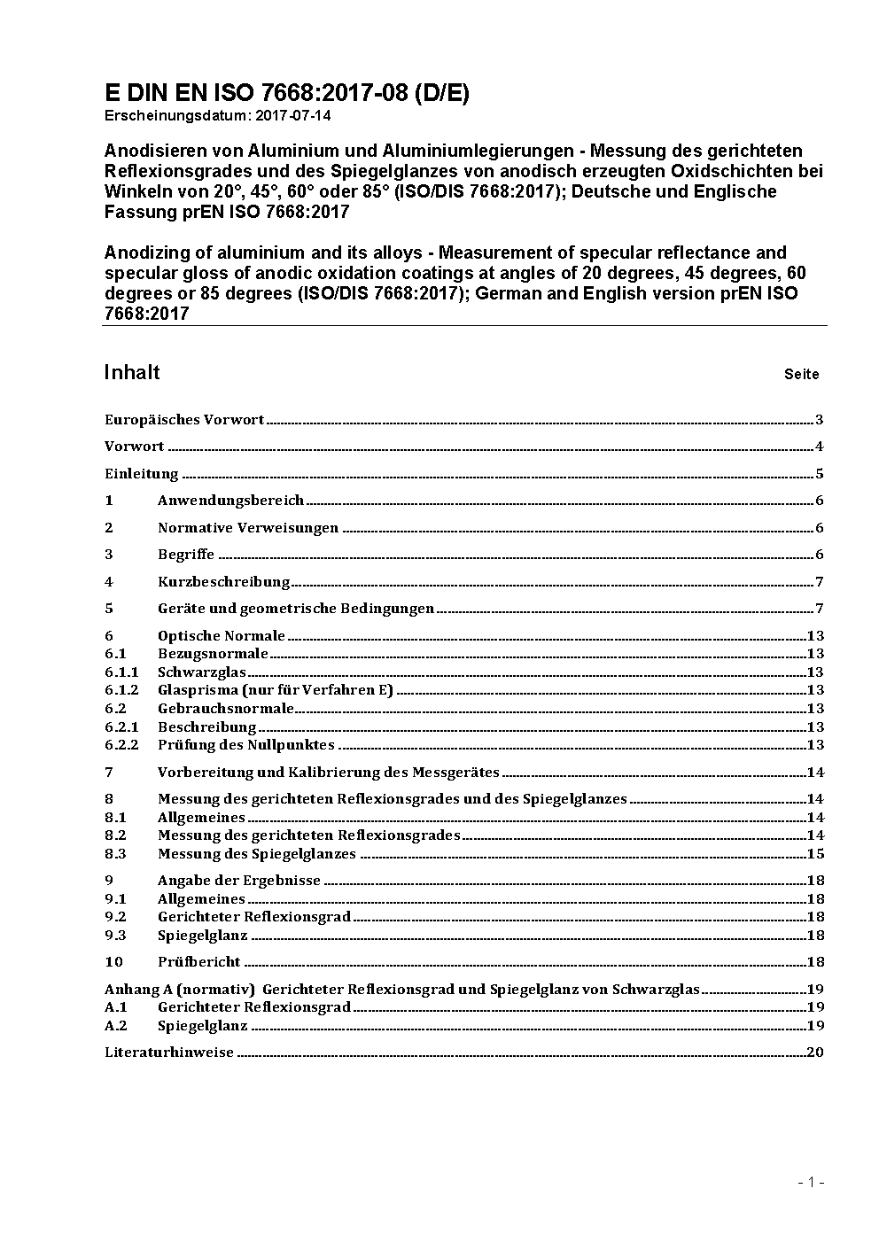 Anodizing of aluminium and its alloys - Measurement of specular reflectance and specular gloss of anodic oxidation coatings at angles of 20 degrees, 45 degrees, 60 degrees or 85 degrees (ISO/DIS 7668:2017); German and English version prEN ISO 7668:2017