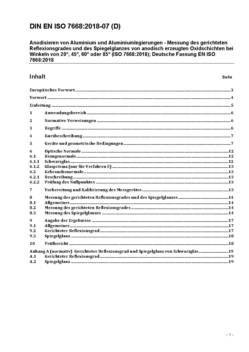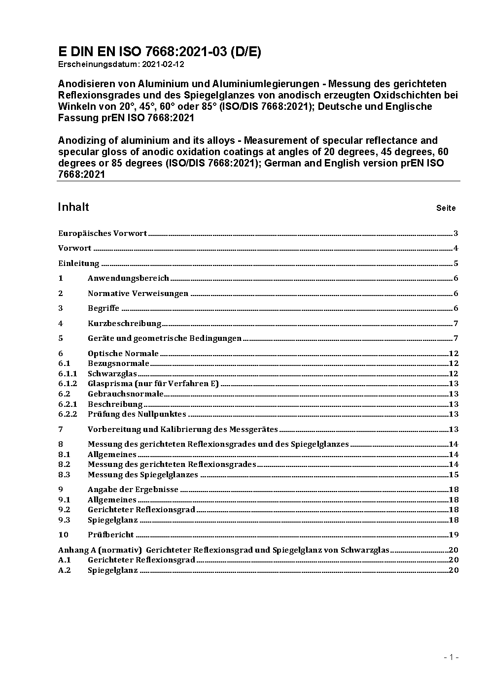 Anodisieren von Aluminium und Aluminiumlegierungen - Messung des gerichteten Reflexionsgrades und des Spiegelglanzes von anodisch erzeugten Oxidschichten bei Winkeln von 20°, 45°, 60° oder 85° (ISO/DIS 7668:2017); Deutsche und Englische Fassung prEN ISO 7668:2017