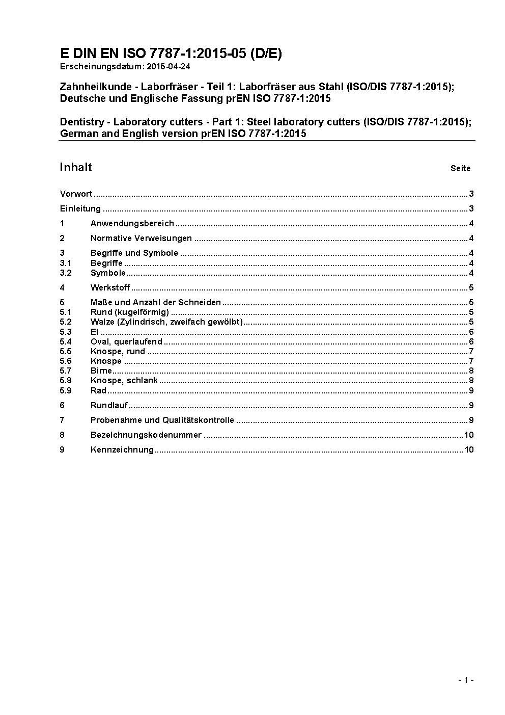 Zahnheilkunde - Laborfräser - Teil 1: Laborfräser aus Stahl (ISO/DIS 7787-1:2015); Deutsche und Englische Fassung prEN ISO 7787-1:2015