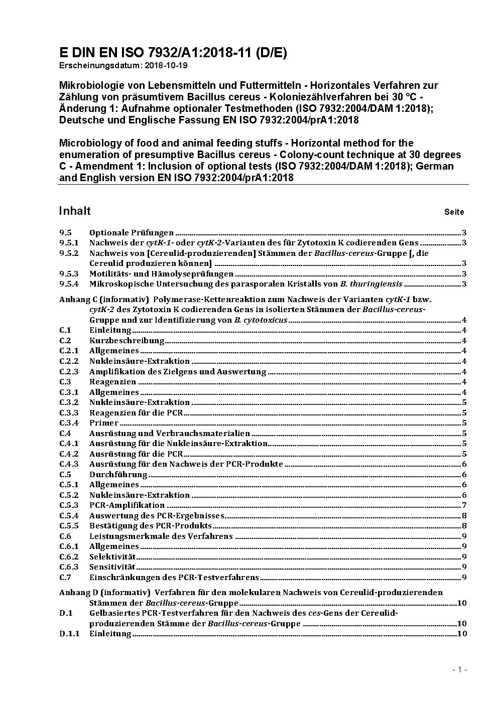 Mikrobiologie von Lebensmitteln und Futtermitteln - Horizontales Verfahren zur Zählung von präsumtivem Bacillus cereus - Koloniezählverfahren bei 30 °C (ISO 7932:2004); Deutsche Fassung EN ISO 7932:2004