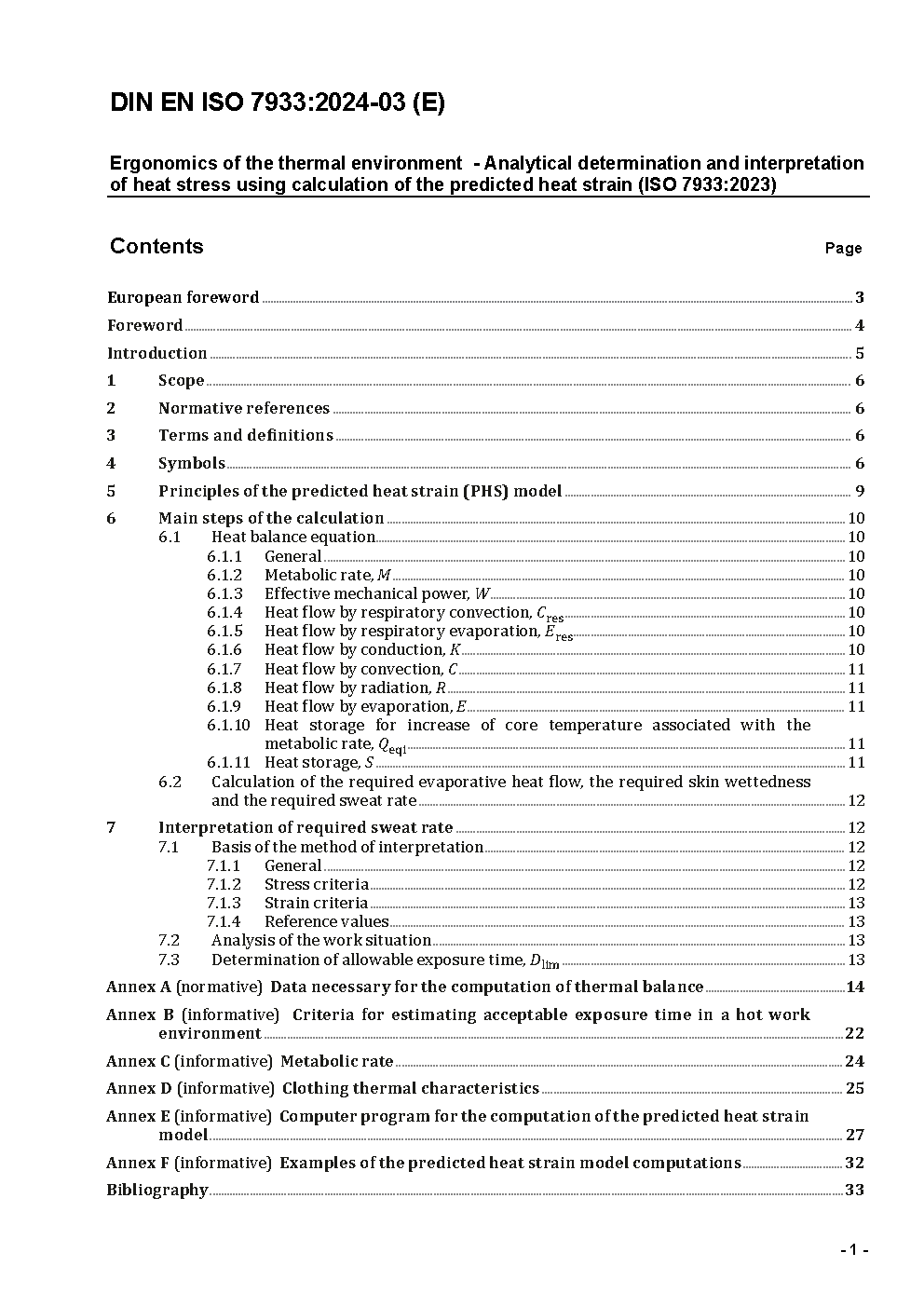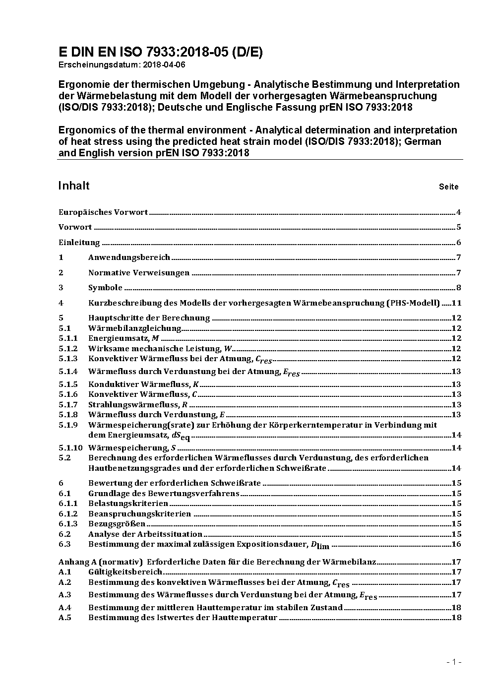 Ergonomie der thermischen Umgebung - Analytische Bestimmung und Interpretation der Wärmebelastung durch Berechnung der vorhergesagten Wärmebeanspruchung (ISO 7933:2004); Deutsche Fassung EN ISO 7933:2004