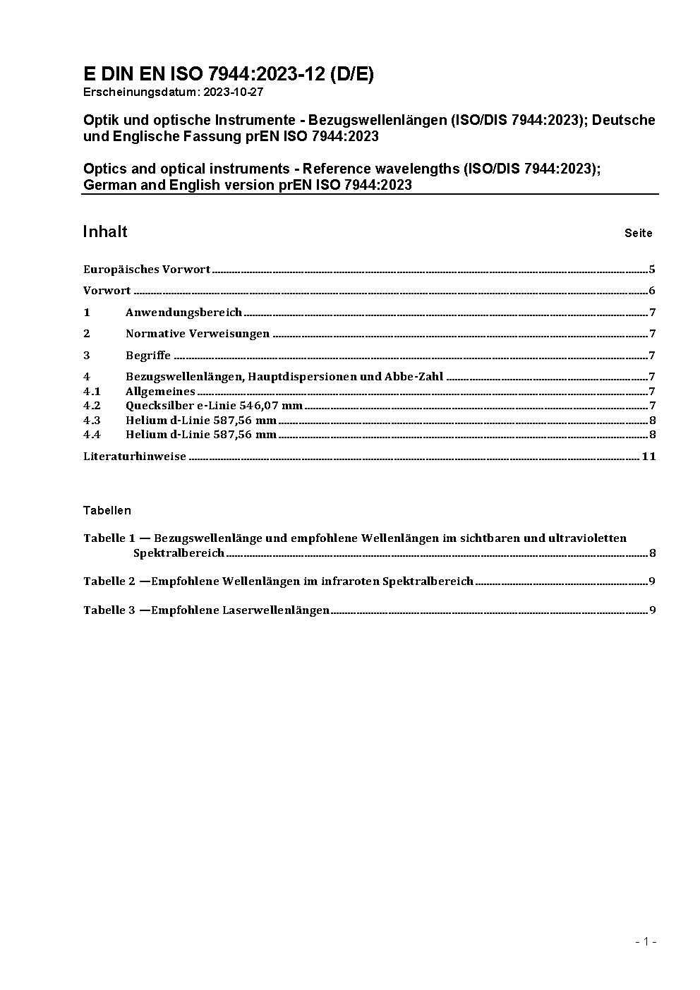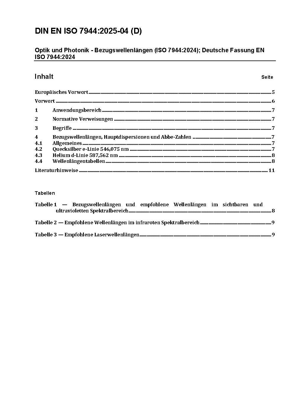 Optics and optical instruments - Reference wavelengths (ISO 7944:1998); German version EN ISO 7944:1998