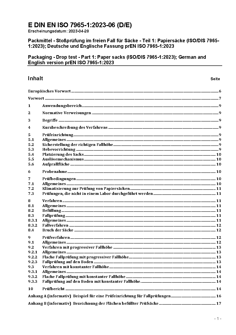 Packaging - Drop test - Part 1: Paper sacks (ISO/DIS 7965-1:2023); German and English version prEN ISO 7965-1:2023