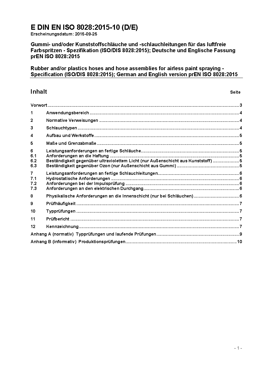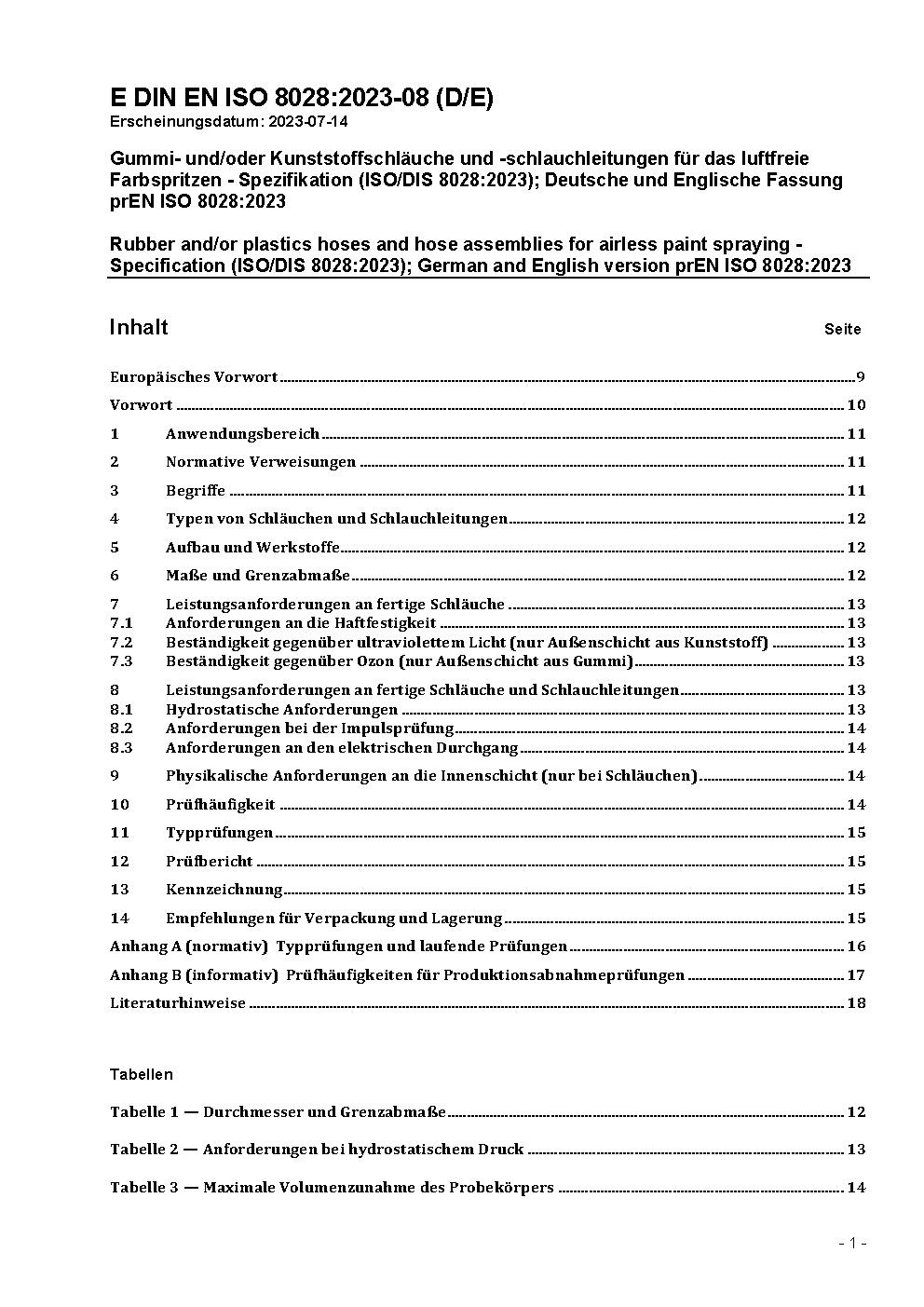 Gummi- und/oder Kunststoffschläuche und -schlauchleitungen für das luftfreie Farbspritzen - Spezifikation (ISO/DIS 8028:2023); Deutsche und Englische Fassung prEN ISO 8028:2023