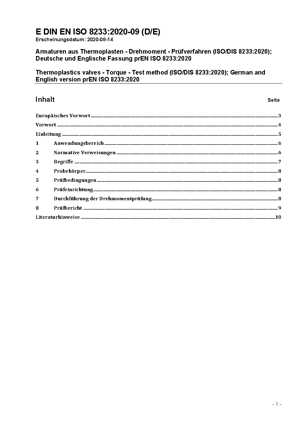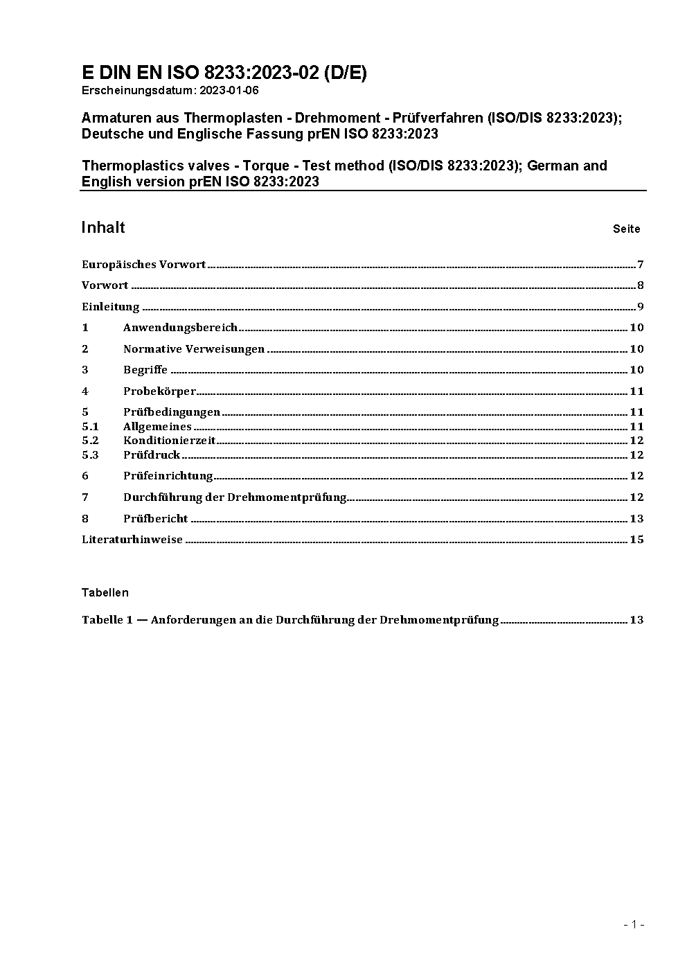 Thermoplastics valves - Torque - Test method (ISO/DIS 8233:2023); German and English version prEN ISO 8233:2023
