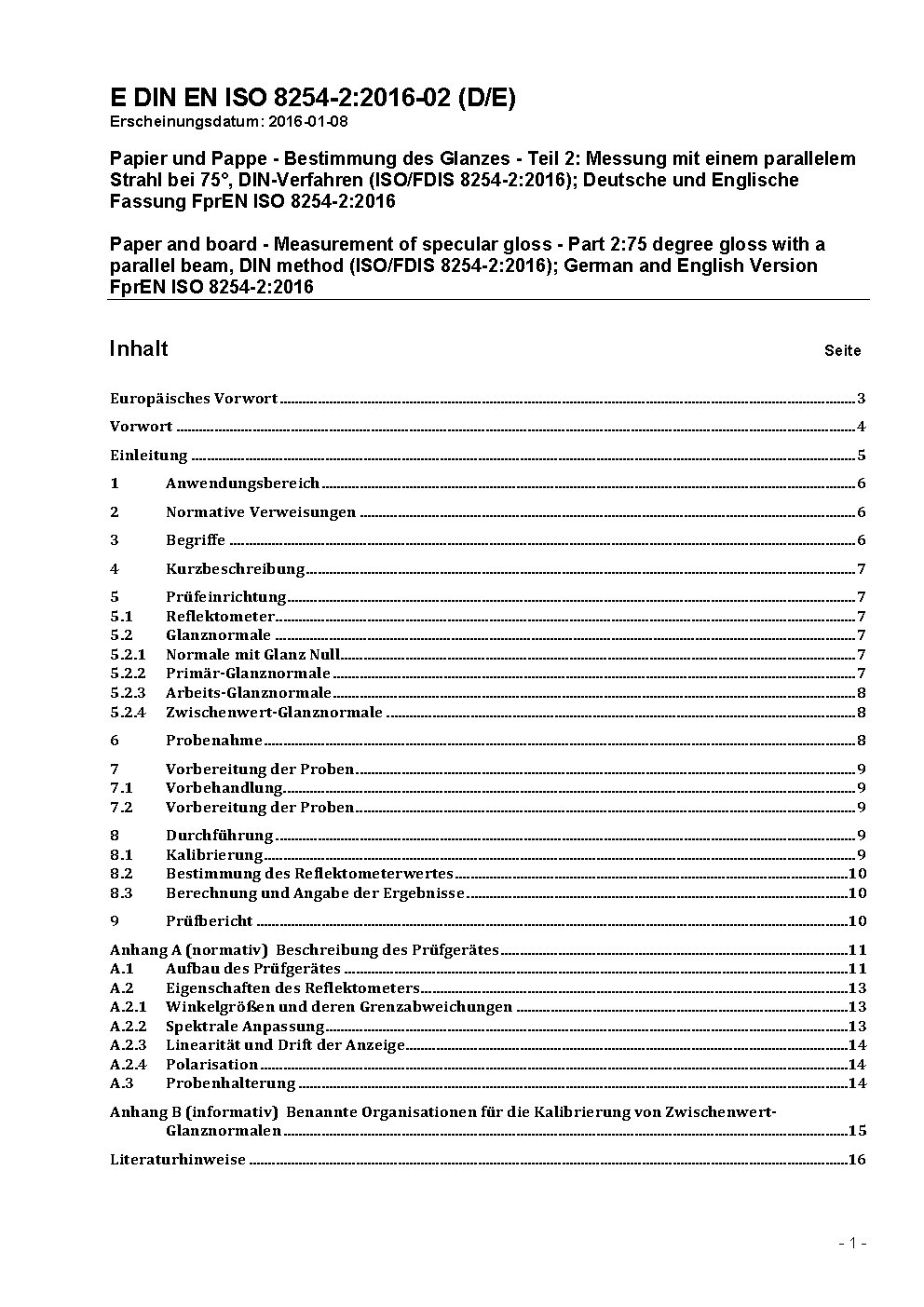 Papier und Pappe - Bestimmung des Glanzes - Teil 2: Messung mit einem parallelen Strahl bei 75°, DIN-Verfahren (ISO 8254-2:2016); Deutsche Fassung EN ISO 8254-2:2016