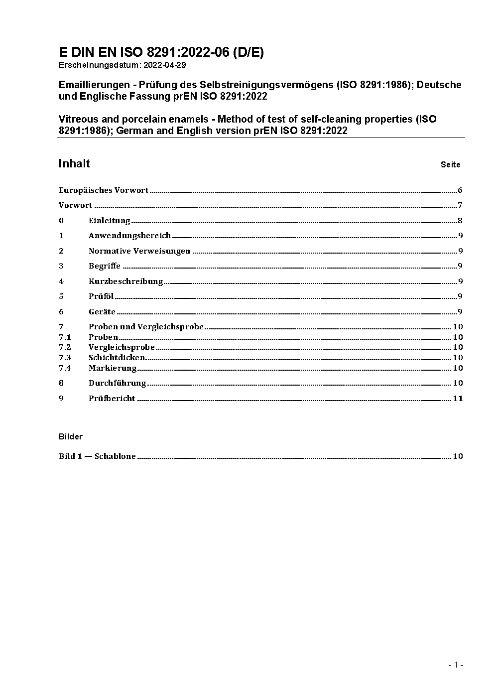 Emaillierungen - Prüfung des Selbstreinigungsvermögens (ISO 8291:1986); Deutsche und Englische Fassung prEN ISO 8291:2022