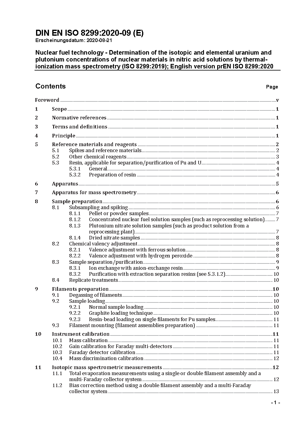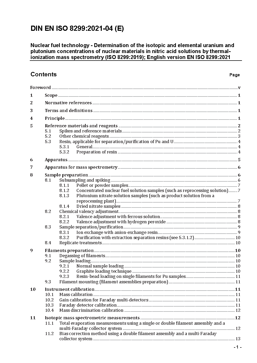 Kernbrennstofftechnologie - Bestimmung des Isotopengehaltes und der natürlichen Uran- und Plutoniumkonzentrationen kerntechnischer Werkstoffe in Salpetersäure-Lösungen durch Massenspektrometrie mit Wärmeionisation (ISO 8299:2019); Englische Fassung EN ISO 8299:2021