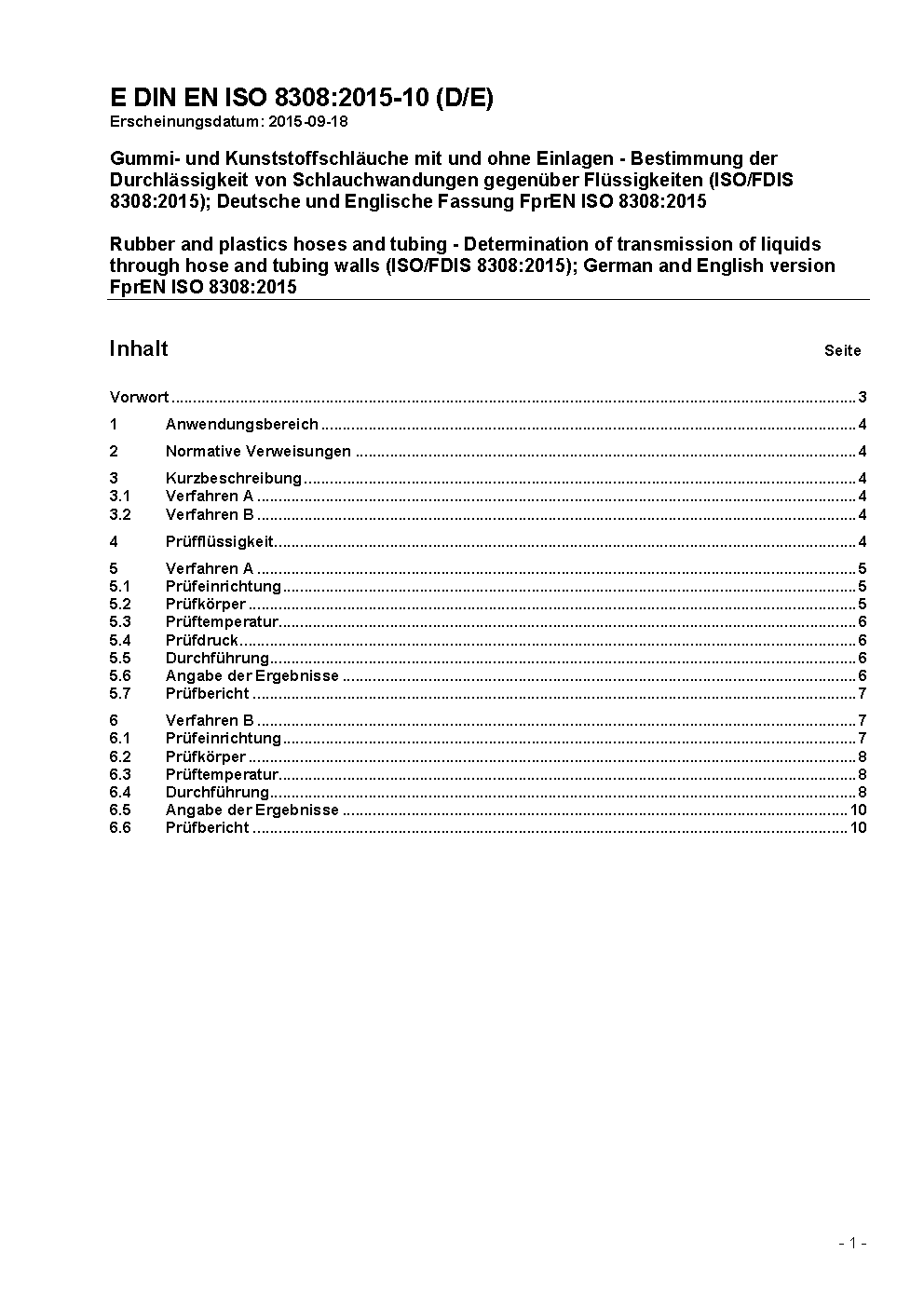 Gummi- und Kunststoffschläuche mit und ohne Einlagen - Bestimmung der Durchlässigkeit von Schlauchwandungen gegenüber Flüssigkeiten (ISO 8308:2006); Deutsche Fassung EN ISO 8308:2008
