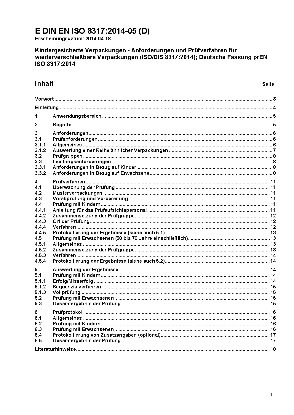 Kindergesicherte Verpackungen - Anforderungen und Prüfverfahren für wiederverschließbare Verpackungen (ISO/DIS 8317:2014); Deutsche Fassung prEN ISO 8317:2014