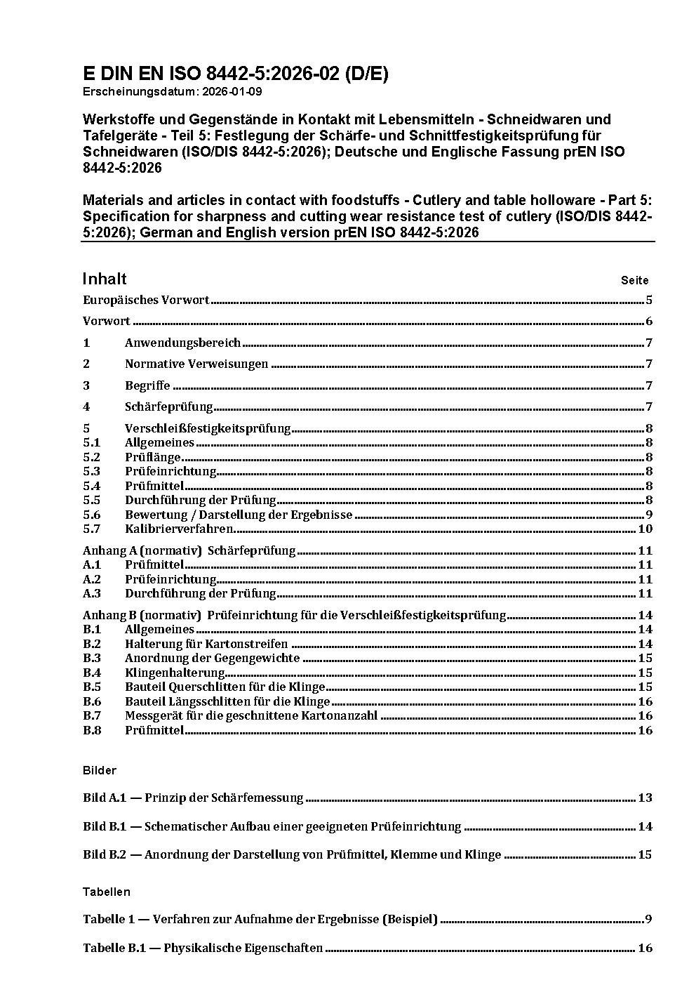 Werkstoffe und Gegenstände in Kontakt mit Lebensmitteln - Schneidwaren und Tafelgeräte - Teil 5: Festlegung der Schneidfähigkeit und Prüfung der Kantenbeständigkeit (ISO 8442-5:2004); Deutsche Fassung EN ISO 8442-5:2004