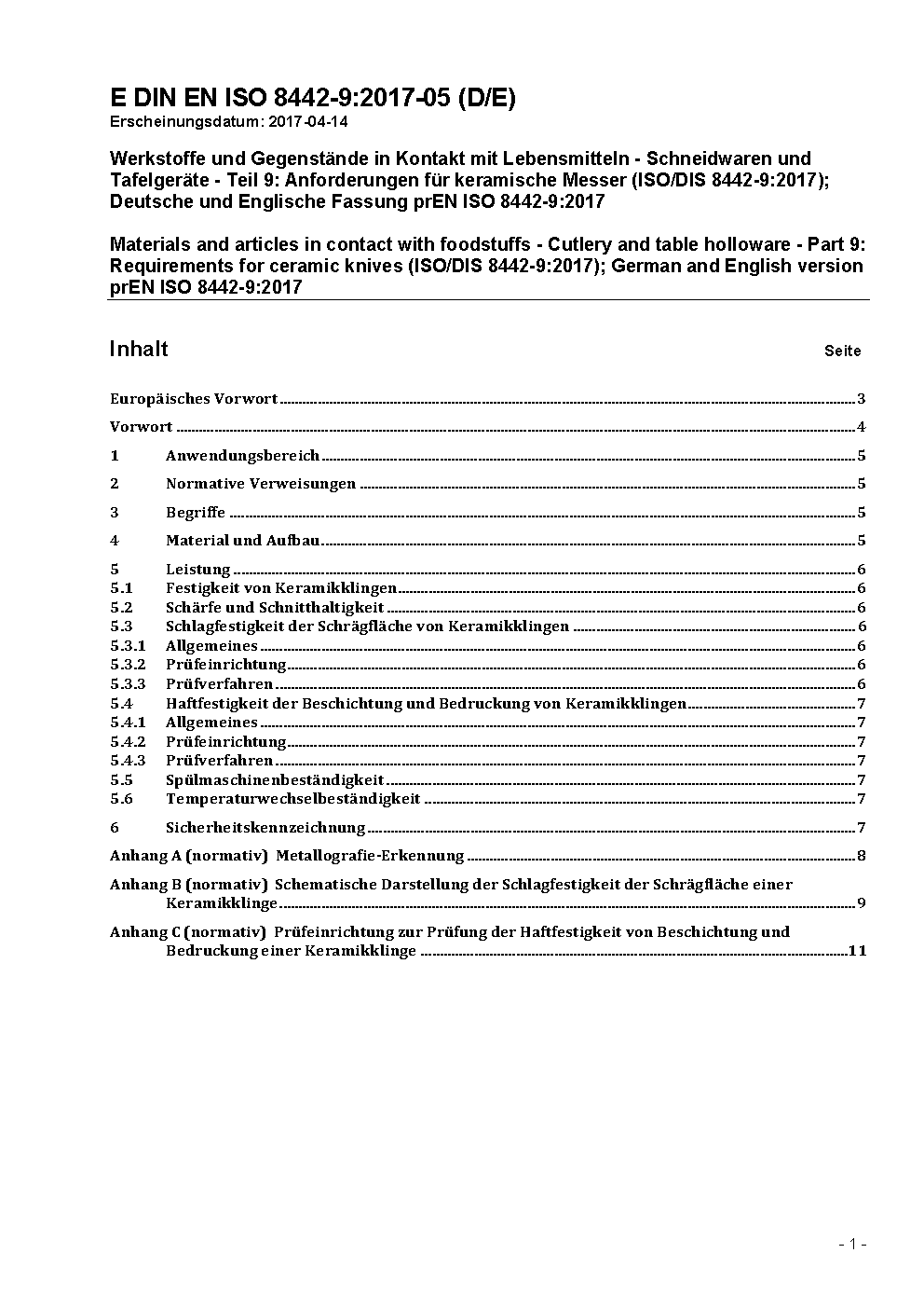 Werkstoffe und Gegenstände in Kontakt mit Lebensmitteln - Schneidwaren und Tafelgeräte - Teil 9: Anforderungen für keramische Messer (ISO/DIS 8442-9:2017); Deutsche und Englische Fassung prEN ISO 8442-9:2017