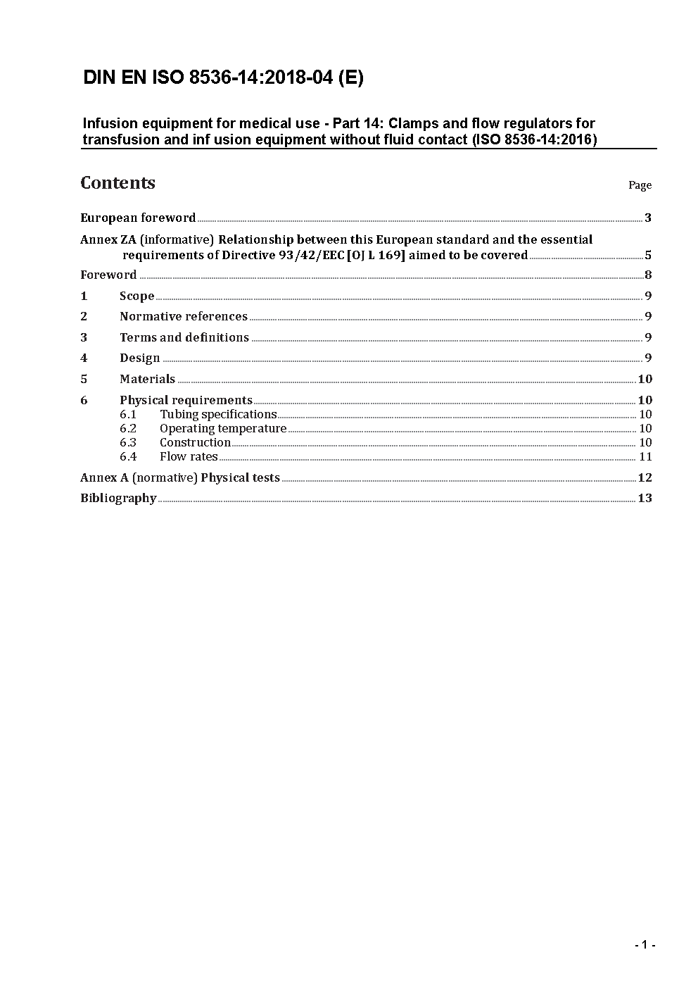 Infusion equipment for medical use - Part 14: Clamps and flow regulators for transfusion and infusion equipment without fluid contact (ISO 8536-14:2016); German version EN ISO 8536-14:2018