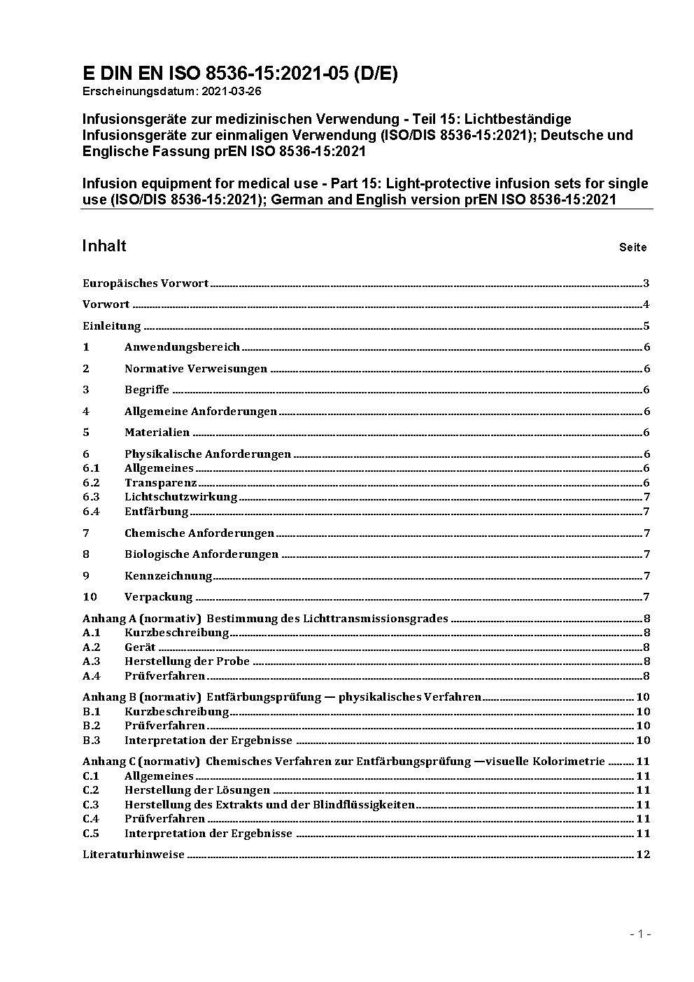 Infusion equipment for medical use - Part 15: Light-protective infusion sets for single use (ISO/DIS 8536-15:2021); German and English version prEN ISO 8536-15:2021