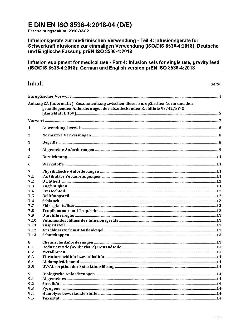 Infusionsgeräte zur medizinischen Verwendung - Teil 4: Infusionsgeräte für Schwerkraftinfusionen zur einmaligen Verwendung (ISO/DIS 8536-4:2018); Deutsche und Englische Fassung prEN ISO 8536-4:2018