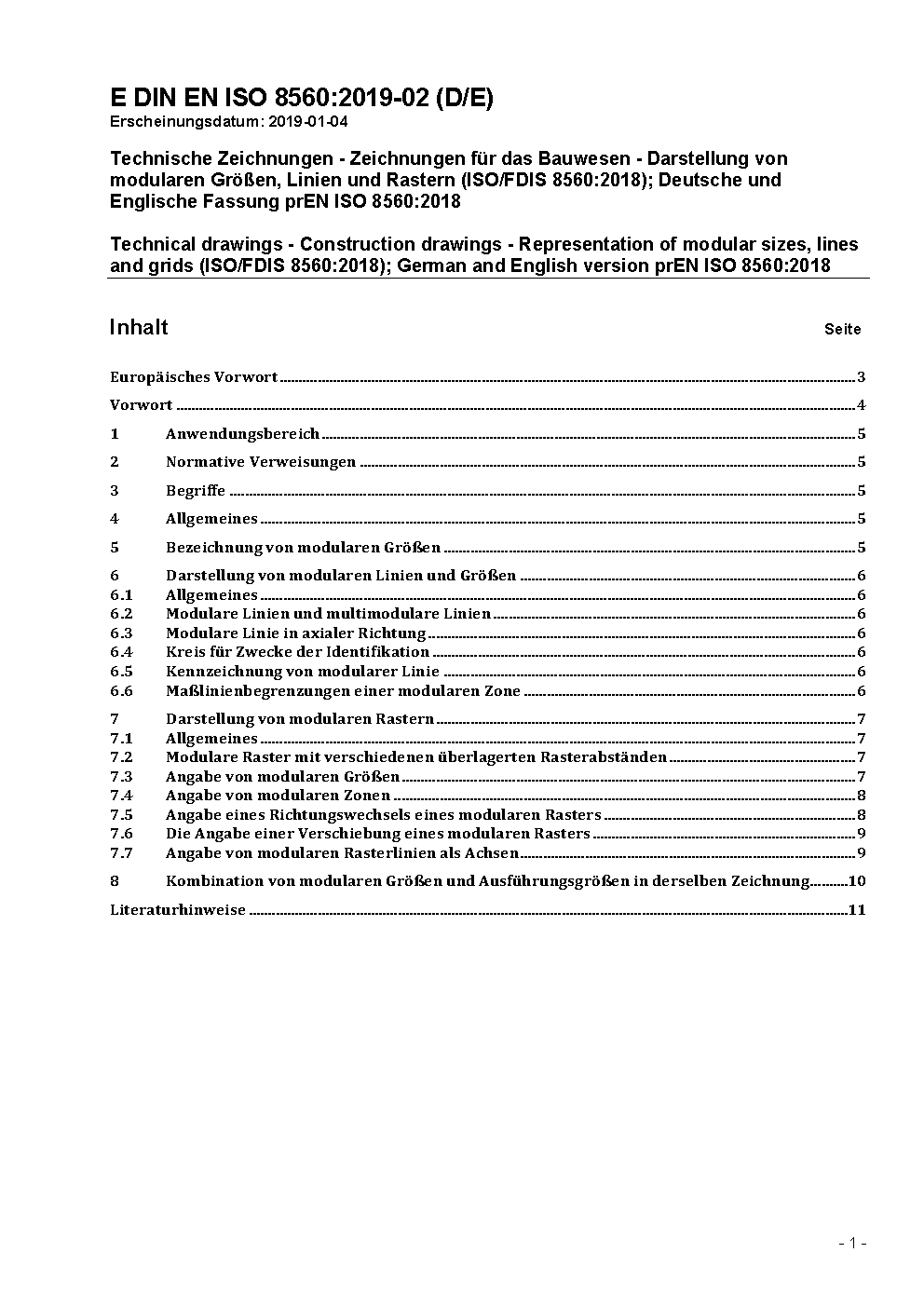Technische Zeichnungen - Zeichnungen für das Bauwesen - Darstellung von modularen Größen, Linien und Rastern (ISO/FDIS 8560:2018); Deutsche und Englische Fassung prEN ISO 8560:2018