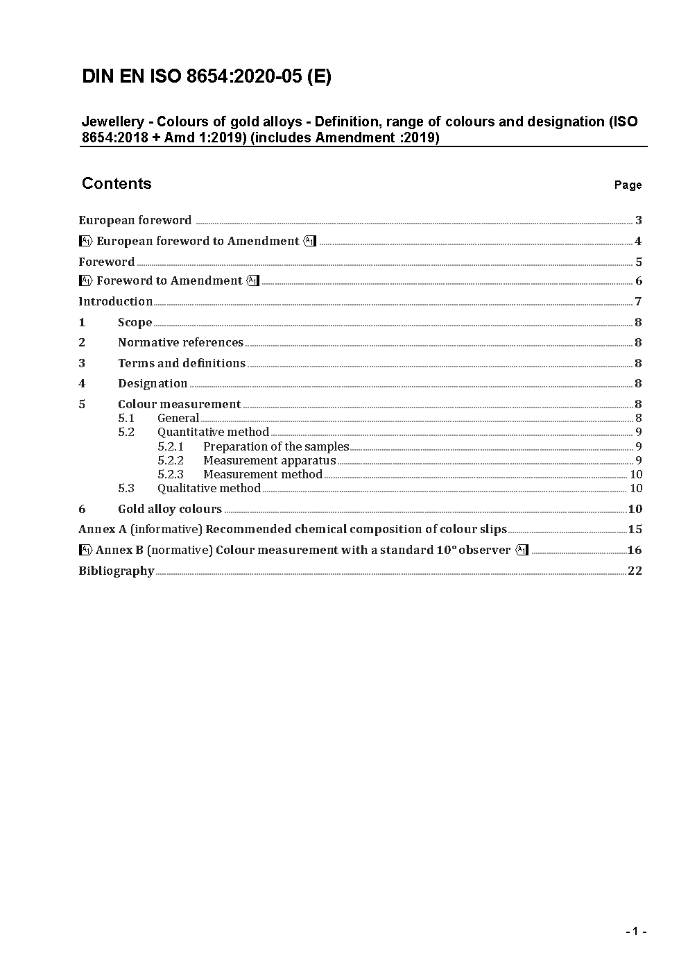 Jewellery - Colours of gold alloys - Definition, range of colours and designation (ISO 8654:2018 + Amd 1:2019); German version EN ISO 8654:2018 + A1:2019