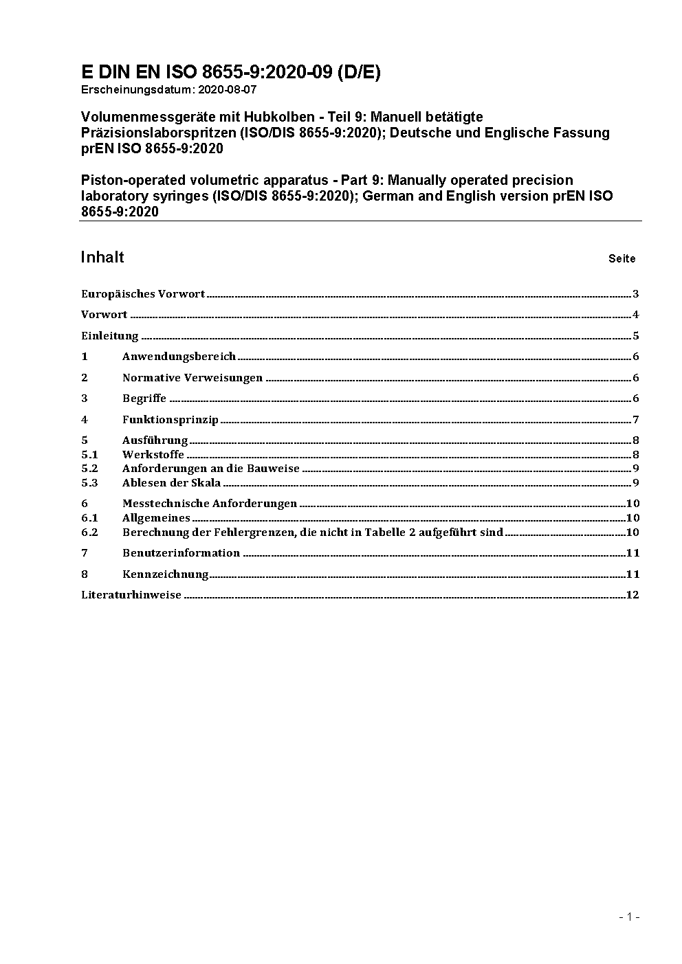 Volumenmessgeräte mit Hubkolben - Teil 9: Manuell betätigte Präzisionslaborspritzen (ISO/DIS 8655-9:2020); Deutsche und Englische Fassung prEN ISO 8655-9:2020