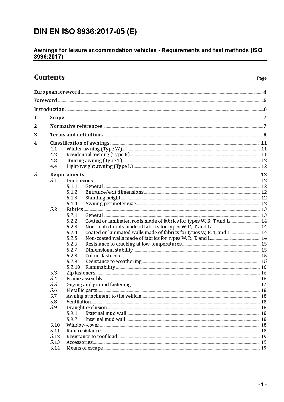 Awnings for leisure accommodation vehicles - Requirements and test methods (ISO 8936:2007); German version EN ISO 8936:2009