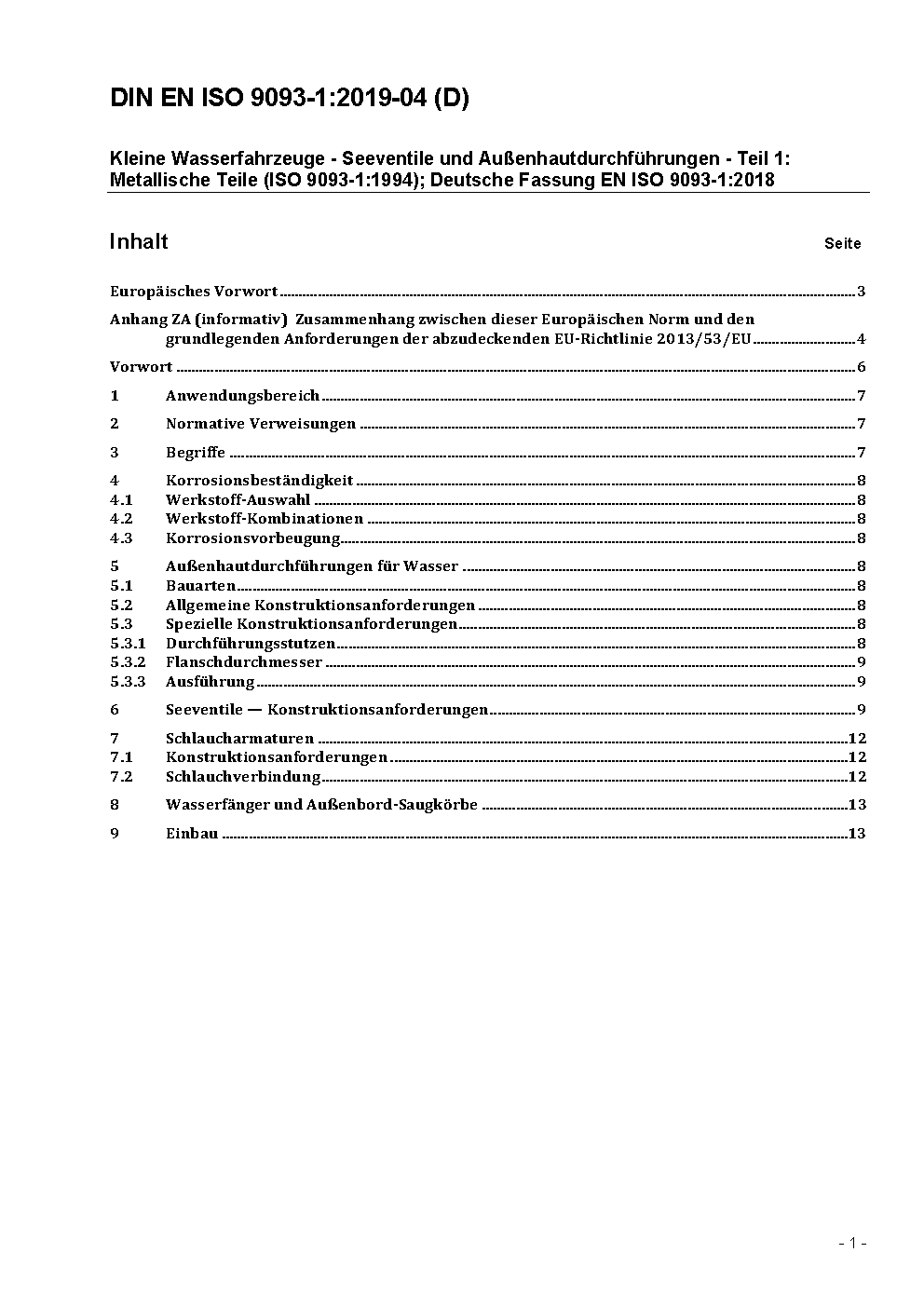 Kleine Wasserfahrzeuge - Seeventile und Außenhautdurchführungen - Teil 1: Metallische Teile (ISO 9093-1:1994); Deutsche Fassung EN ISO 9093-1:1997