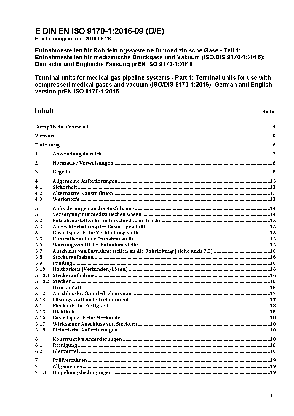 Entnahmestellen für Rohrleitungssysteme für medizinische Gase - Teil 1: Entnahmestellen für medizinische Druckgase und Vakuum (ISO 9170-1:2008); Deutsche Fassung EN ISO 9170-1:2008