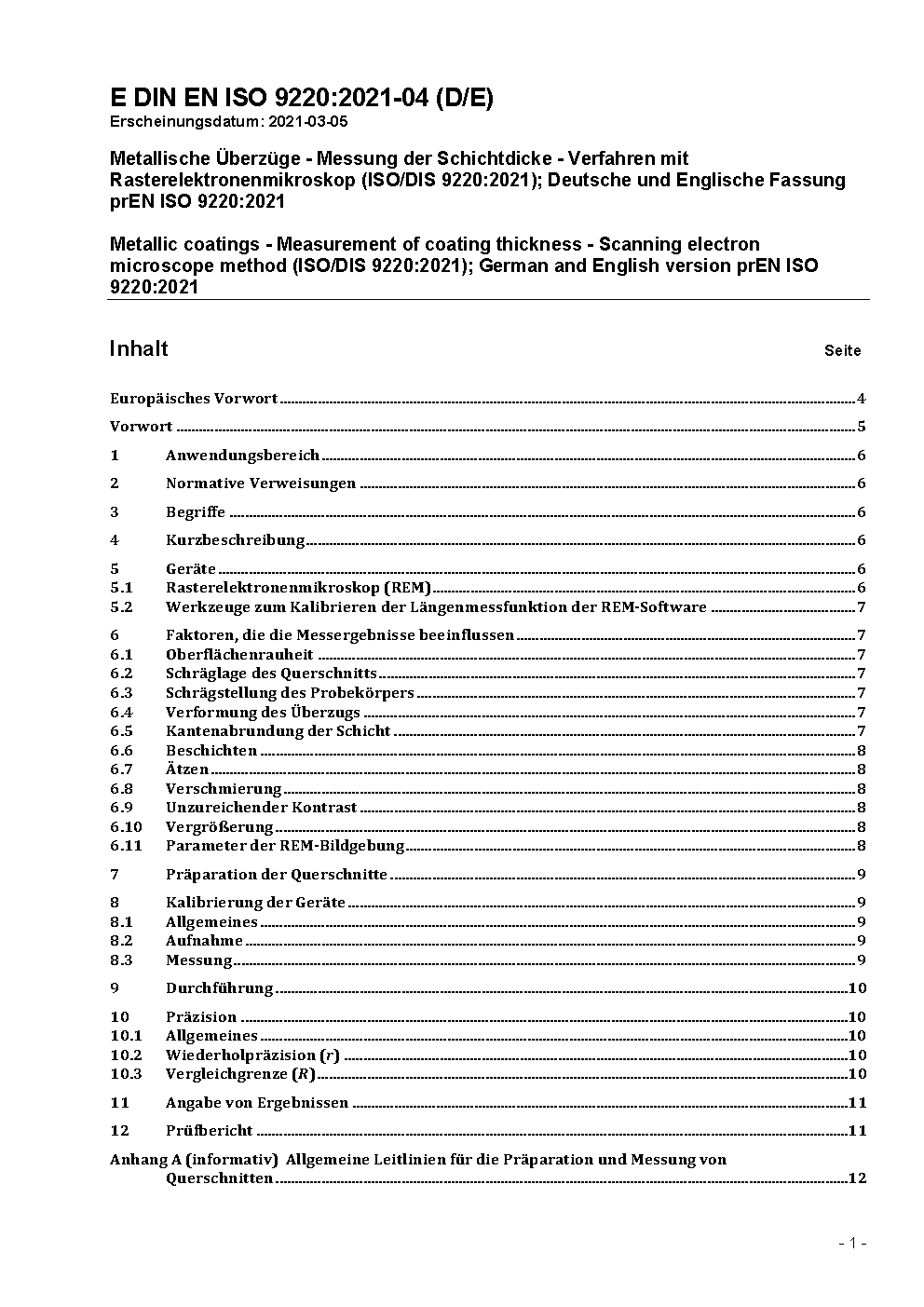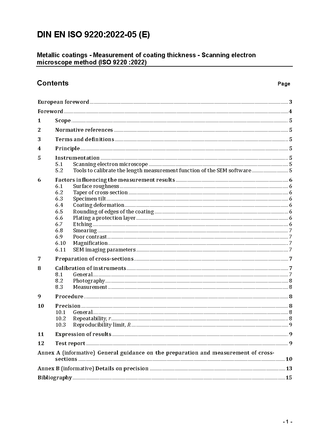 Metallic coatings - Measurement of coating thickness - Scanning electron microscope method (ISO 9220:1988); German version EN ISO 9220:1994